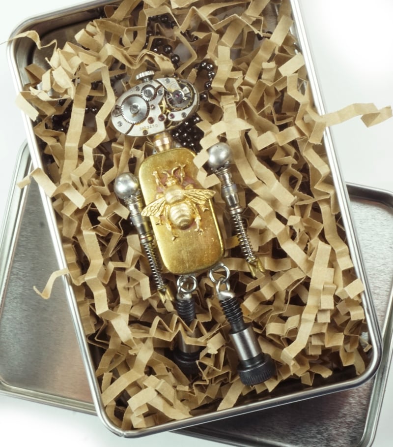 Babybots come in a tin gift box and include a 30" ball chain that can be easily shortened. Best of all, each one opens up to reveal their heart inside.