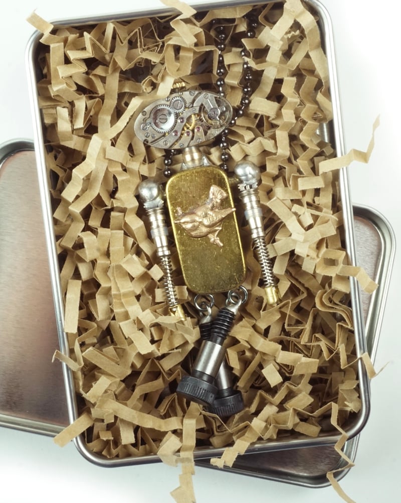 Babybots come in a tin gift box and include a 30" ball chain that can be easily shortened. Best of all, each one opens up to reveal their heart inside.