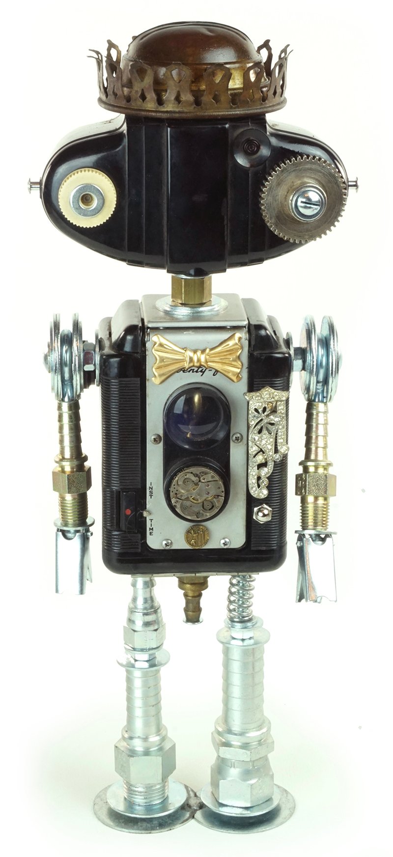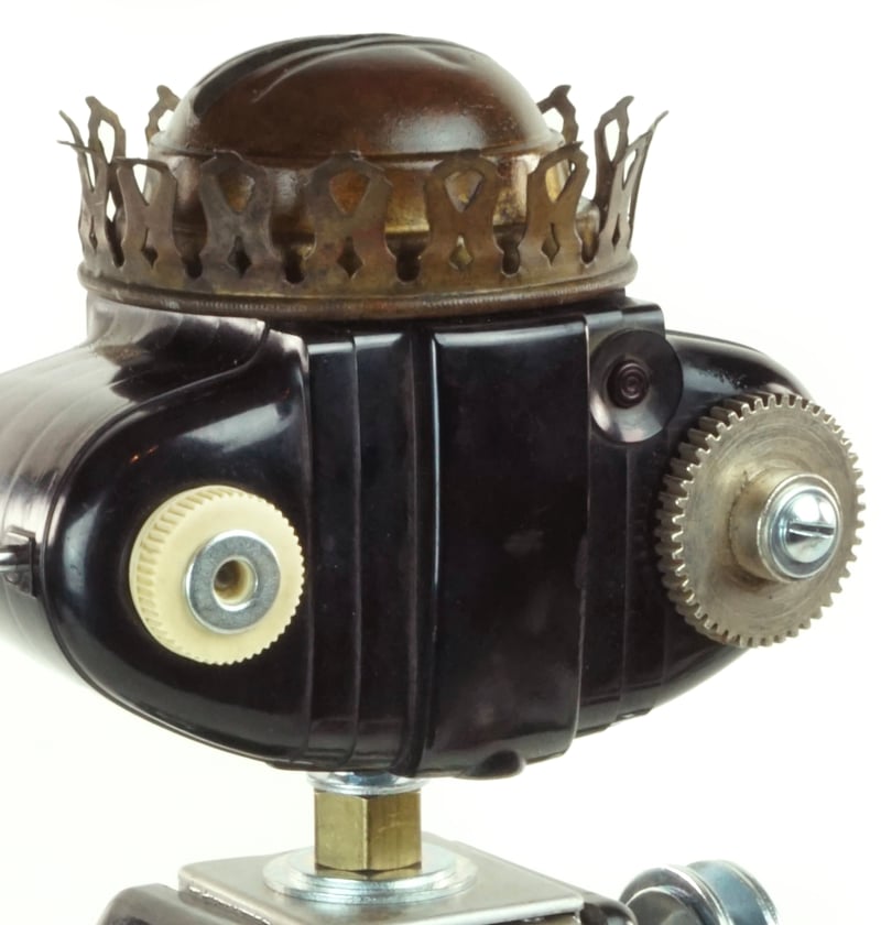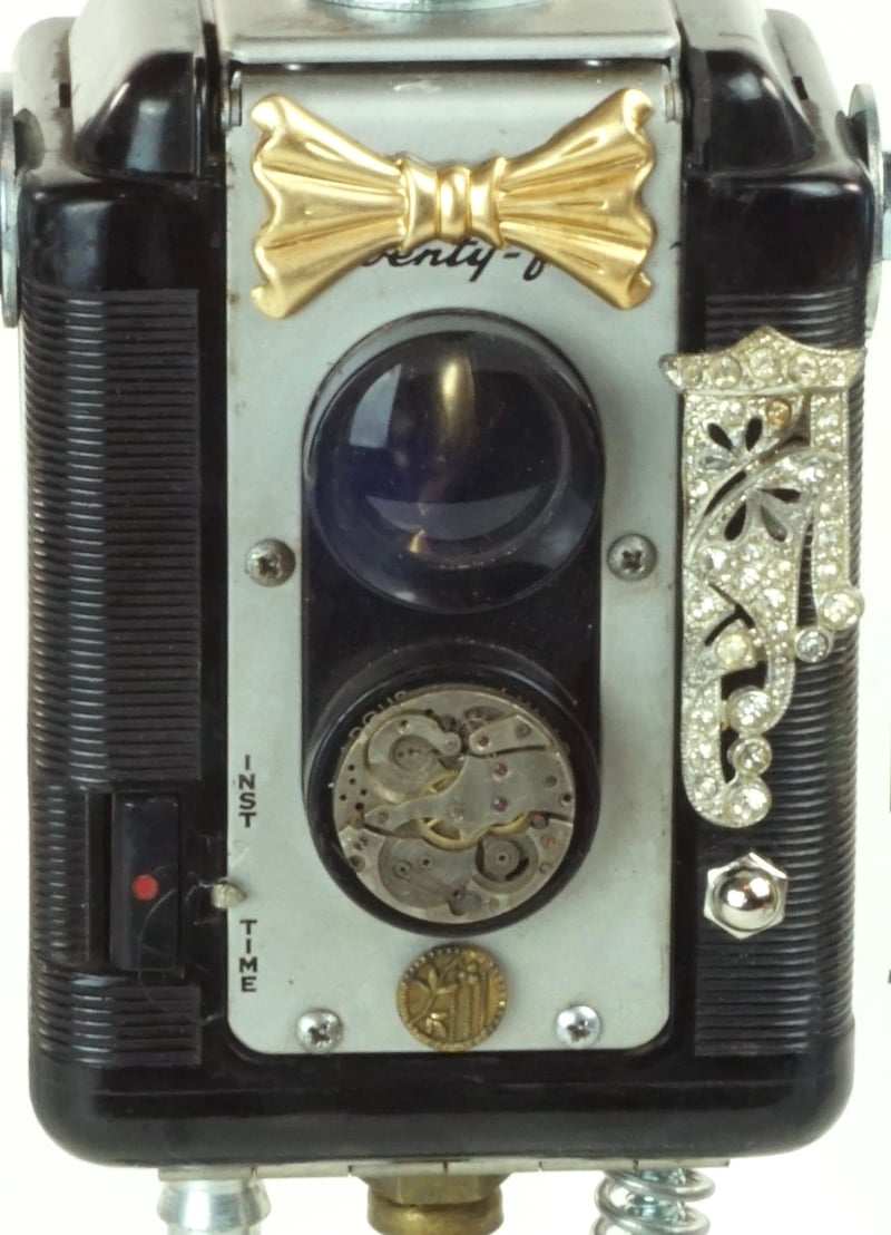 Principal Components: Argus Seventy-Five camera, Kodak 127 camera, oil lamp burner, toggle bolts, hose fittings, clock gears, rhinestone clip, watch movement