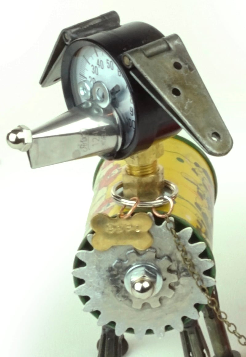 Principal Components: Coin bank, party noisemaker, creamer, 60-61 Chevy tail light lens, hose fittings, wrenches, cake decorating tip, pressure gauge, hinges, molly bolts