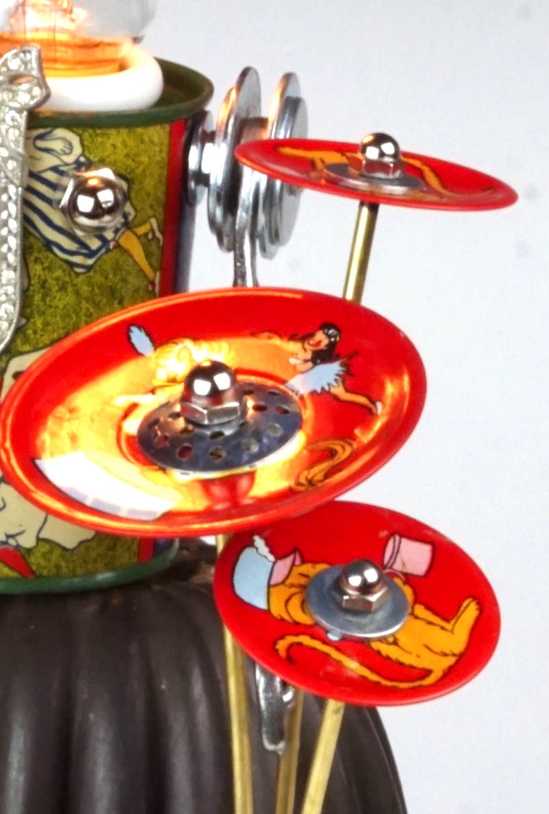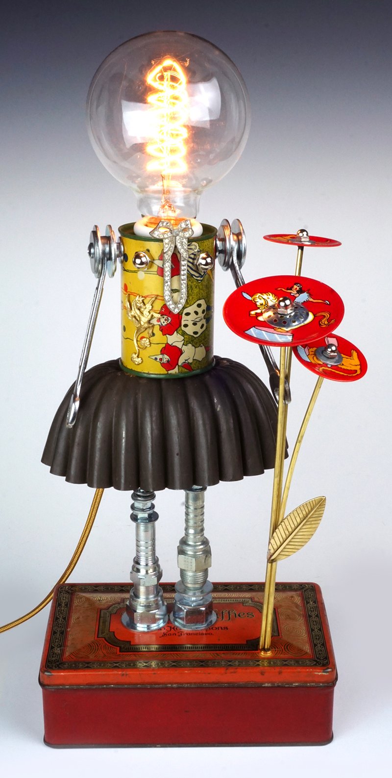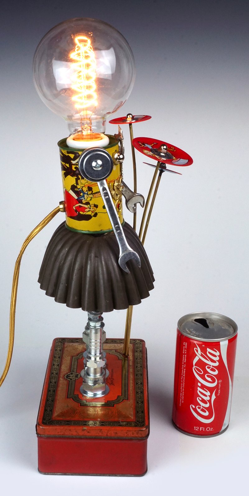 Principal Components: Party noisemaker, reproduction Edison bulb, baking mold, hose fittings, wrenches, tin toy tea set saucers, candy tin