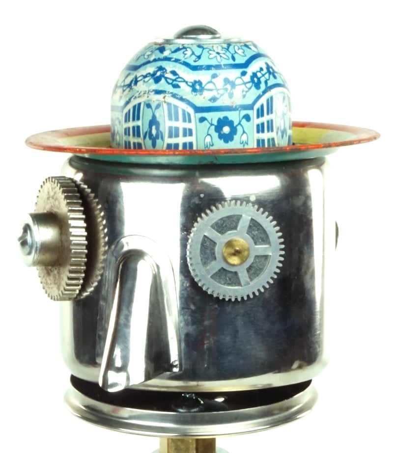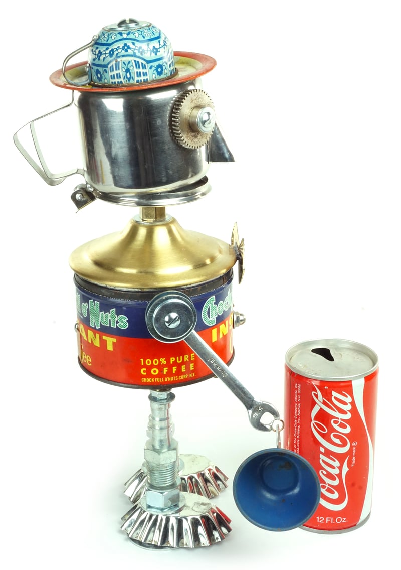 Principal Components: Coffee can, creamer, toy teacups and saucer, clock gears, wrenches, hose fittings, tartlet tins, lamp cap