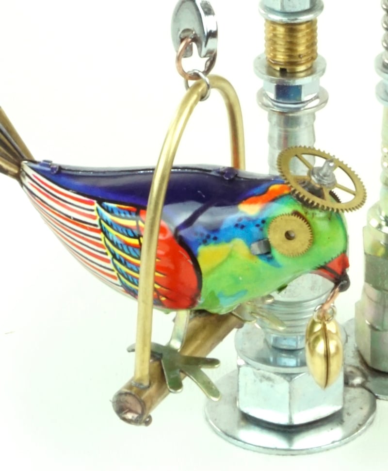 Principal Components: Spice tin, opera glasses, toy cup and saucer, wind-up bird, wrenches, hose fittings, clock gears