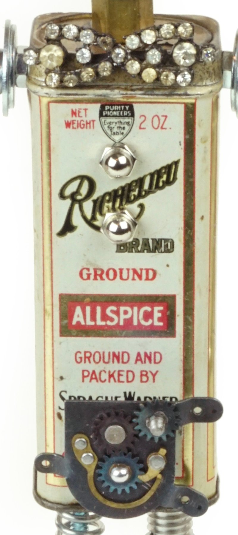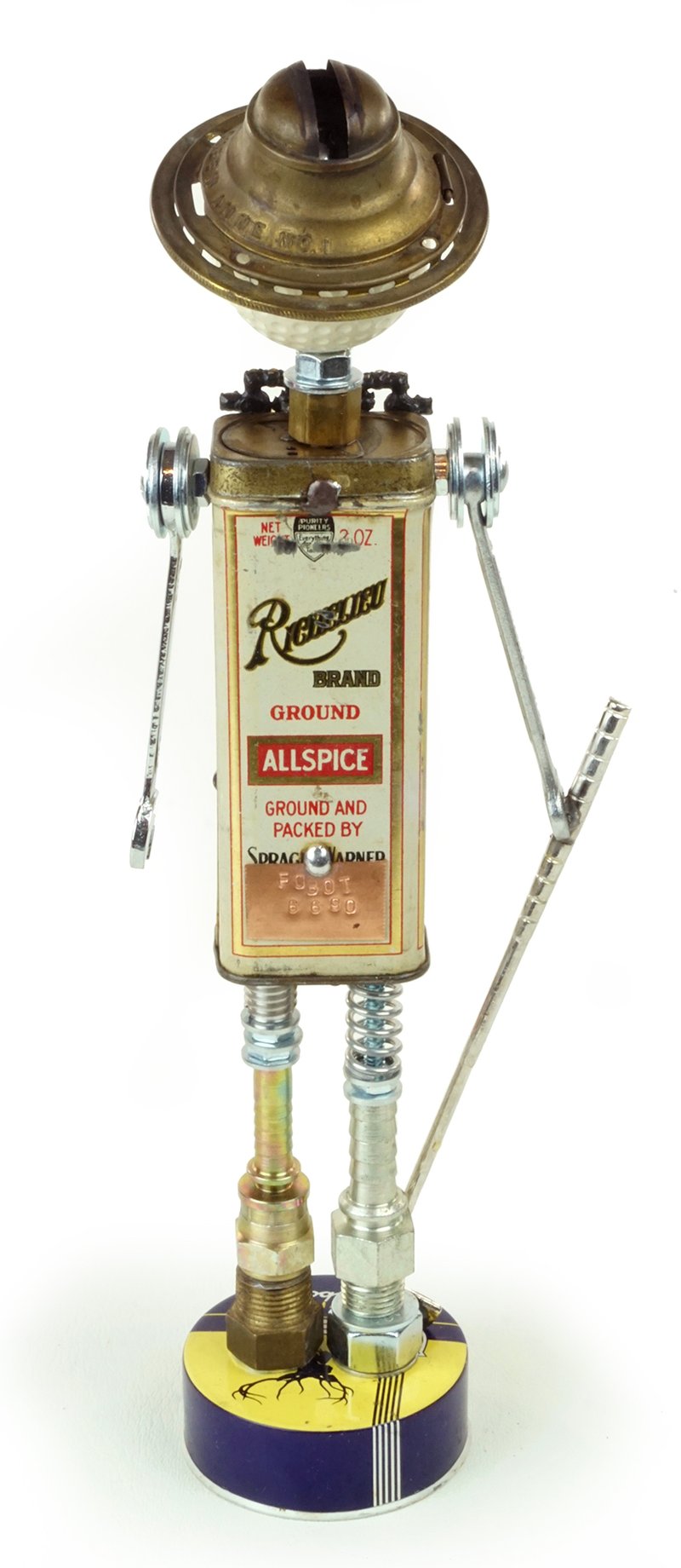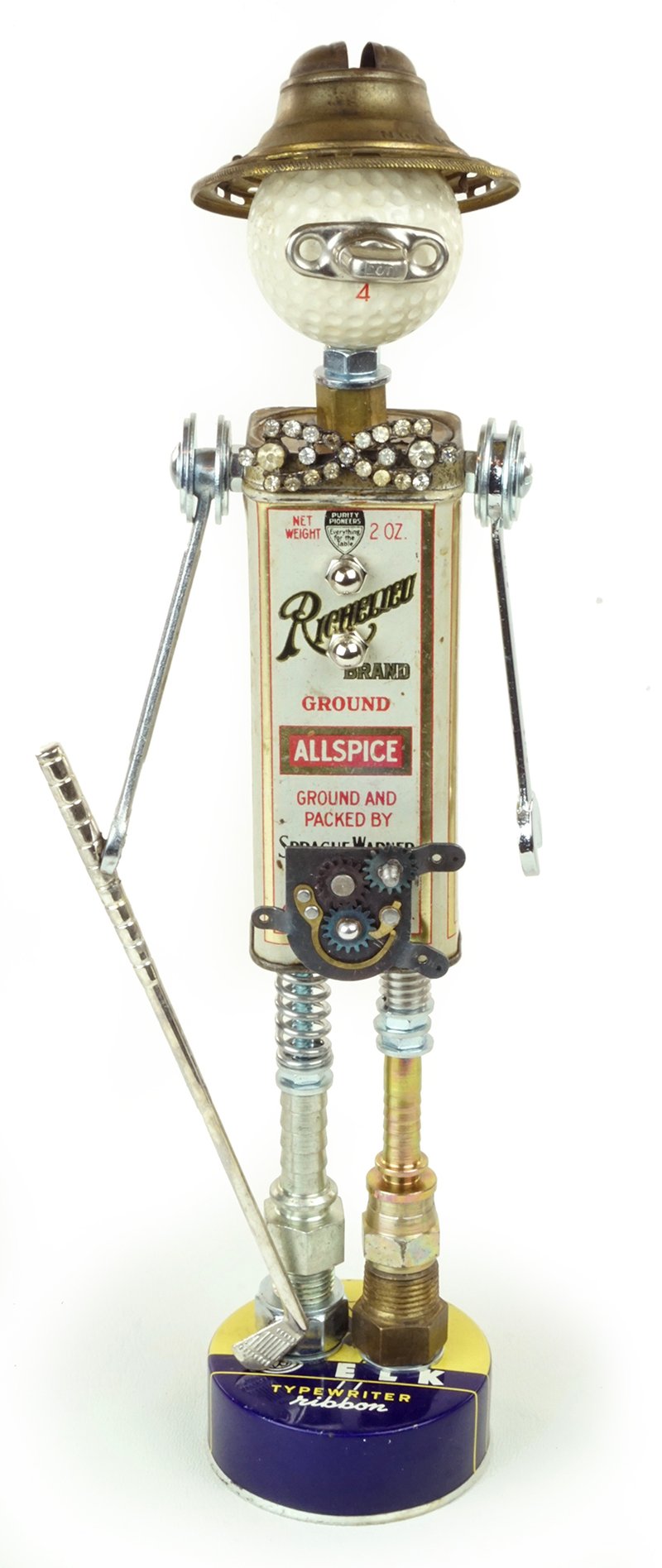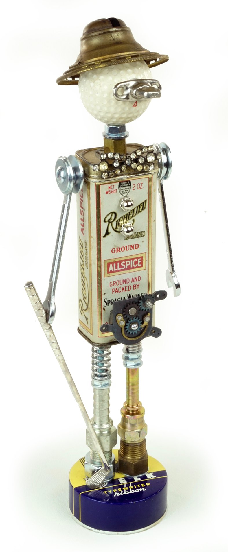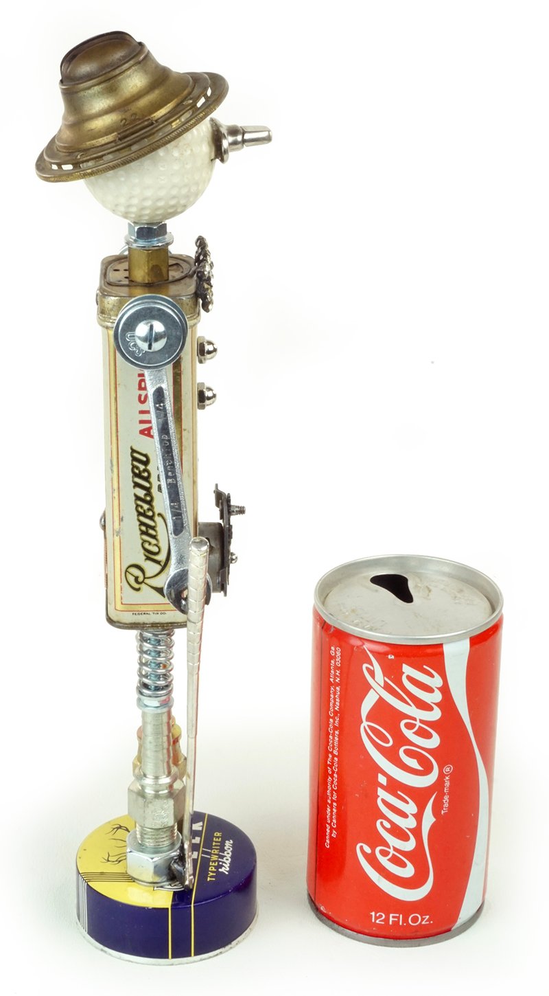 Principal Components: Spice tin, golf ball, tonneau cover latch, oil lamp burner, swizzle stick, wrenches, hose fittings, typewriter ribbon tin, rhinestone clip