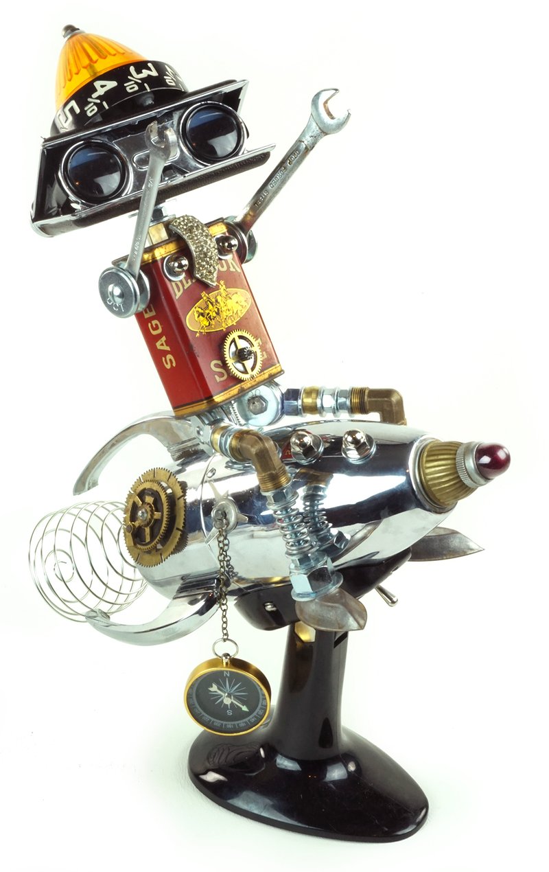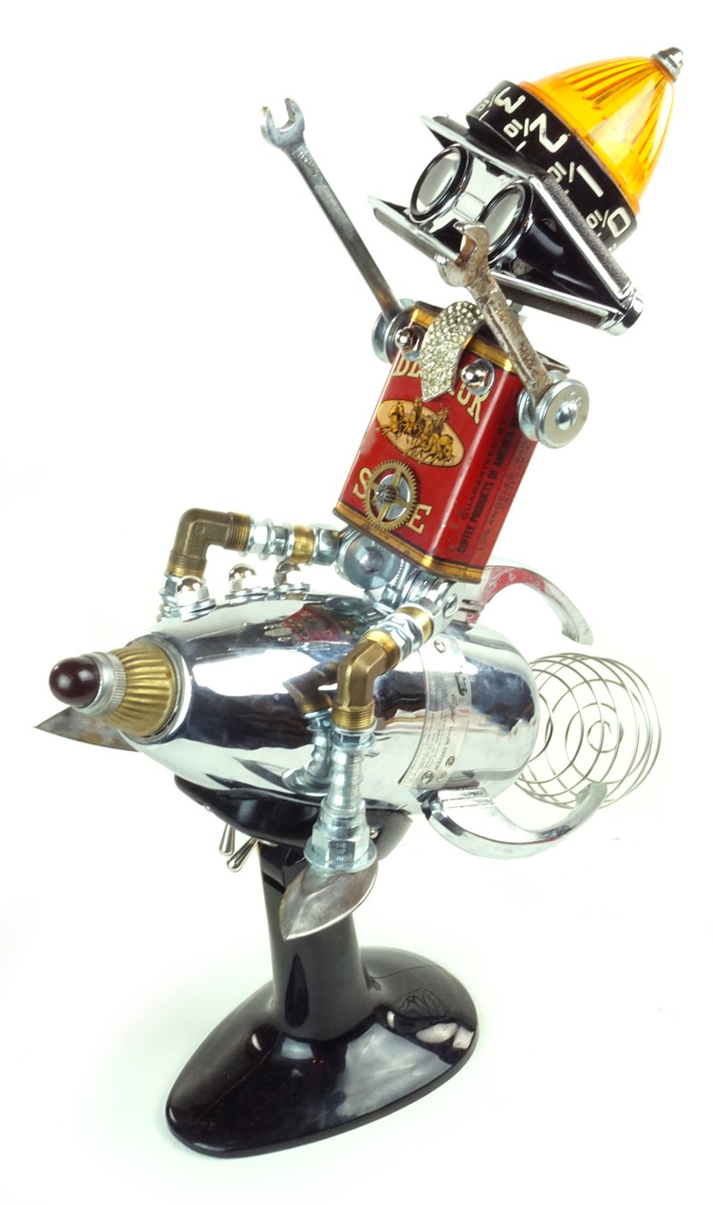 Principal Components: Spice tin, hair dryer, opera glasses, auto signal lens, gas pump dial, cabinet handles, wrenches, whisk, hose fittings, candy molds, compass, clock gear