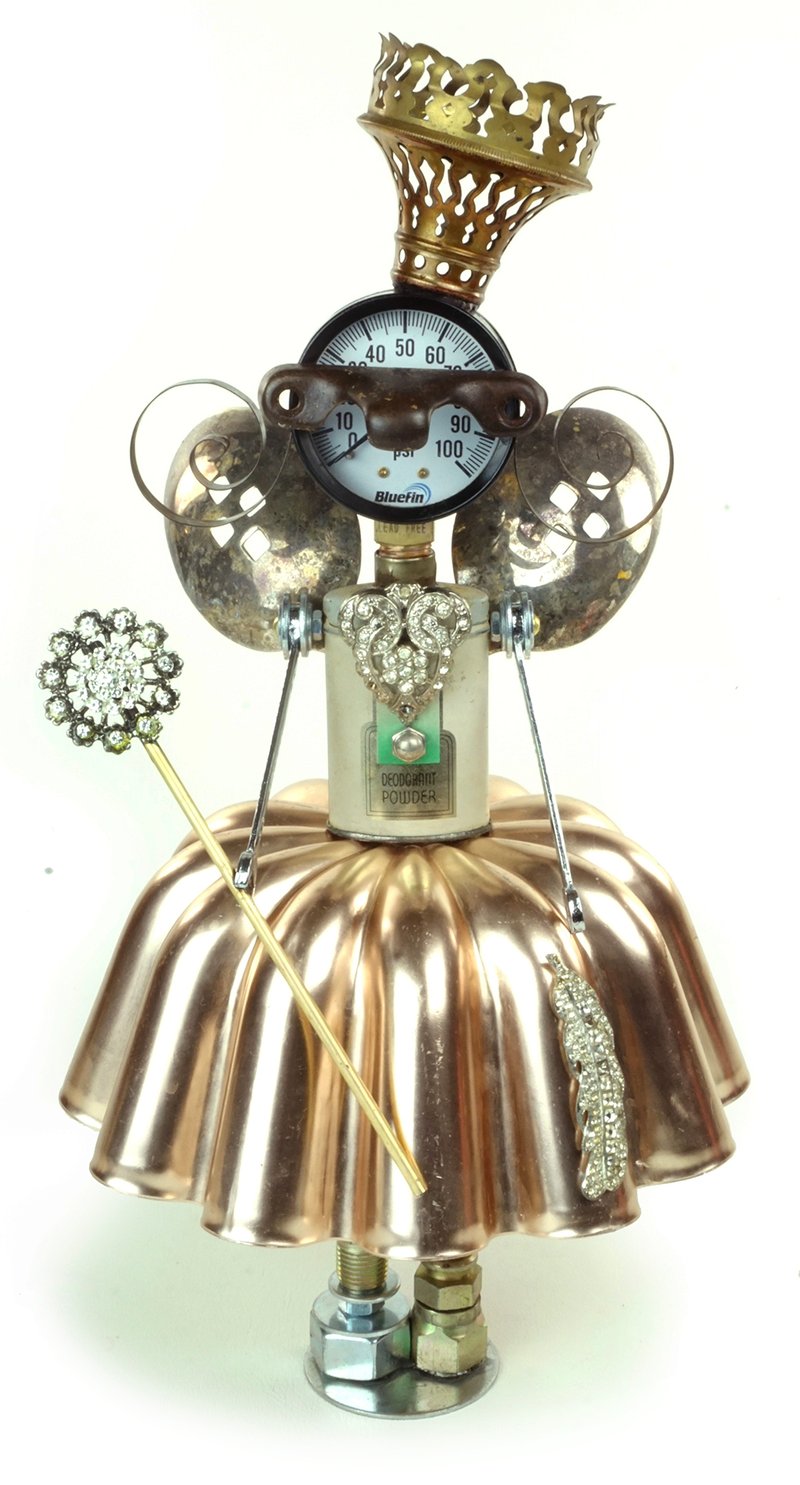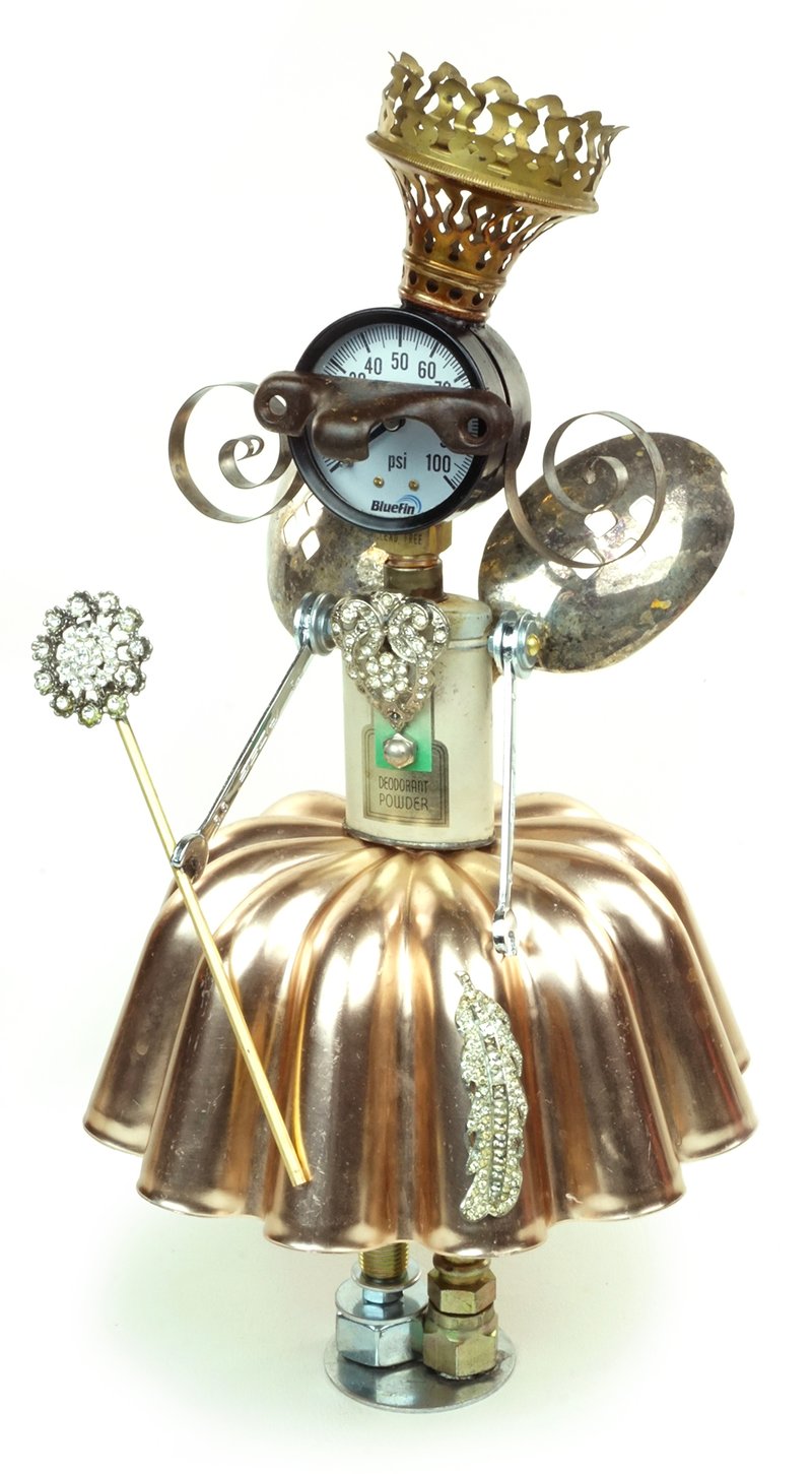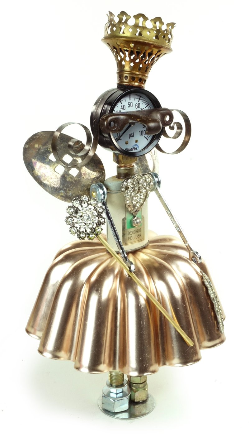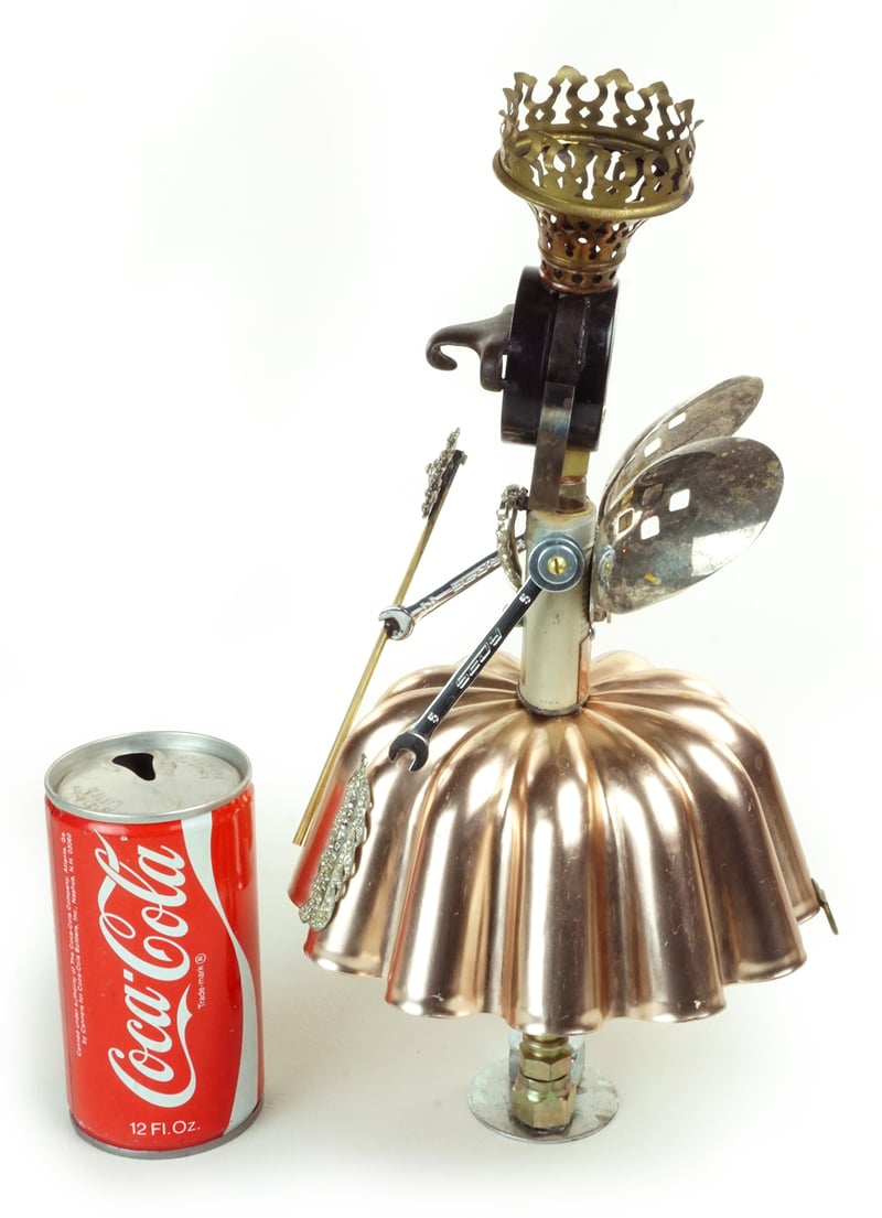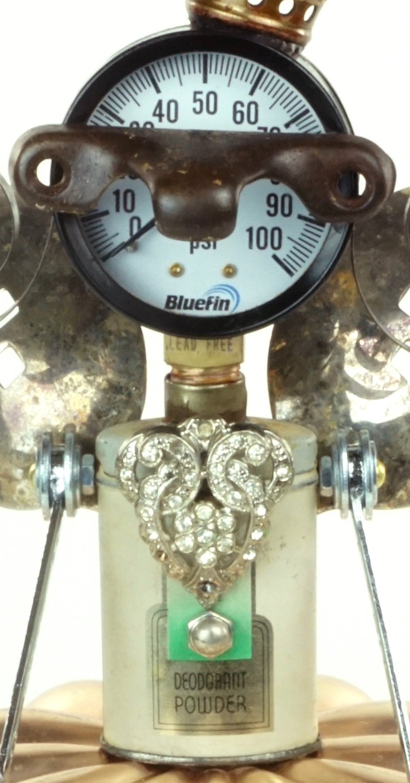 Principal Components: Talc tin, jello mold, clock springs, pressure gauge, sash lock, gas lamp burner, slotted serving spoons, wrenches, hose fittings, rhinestone clip