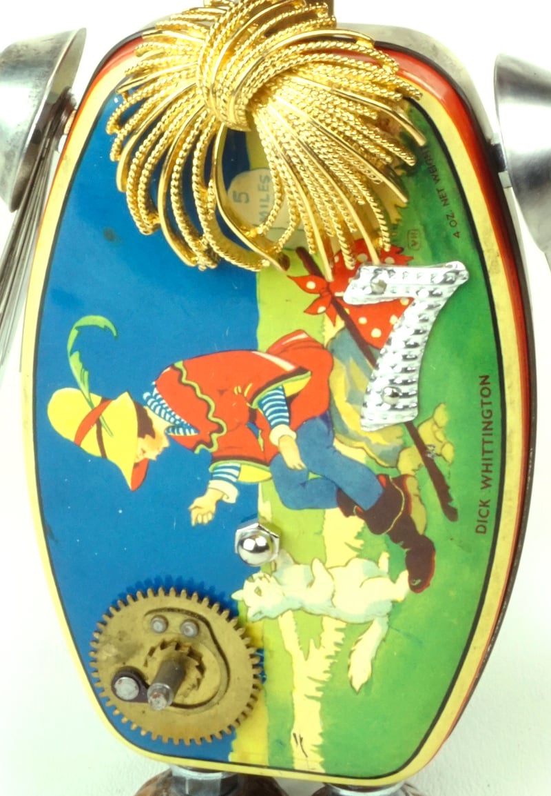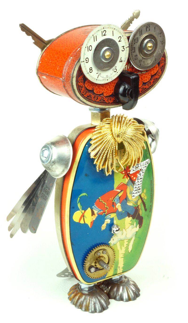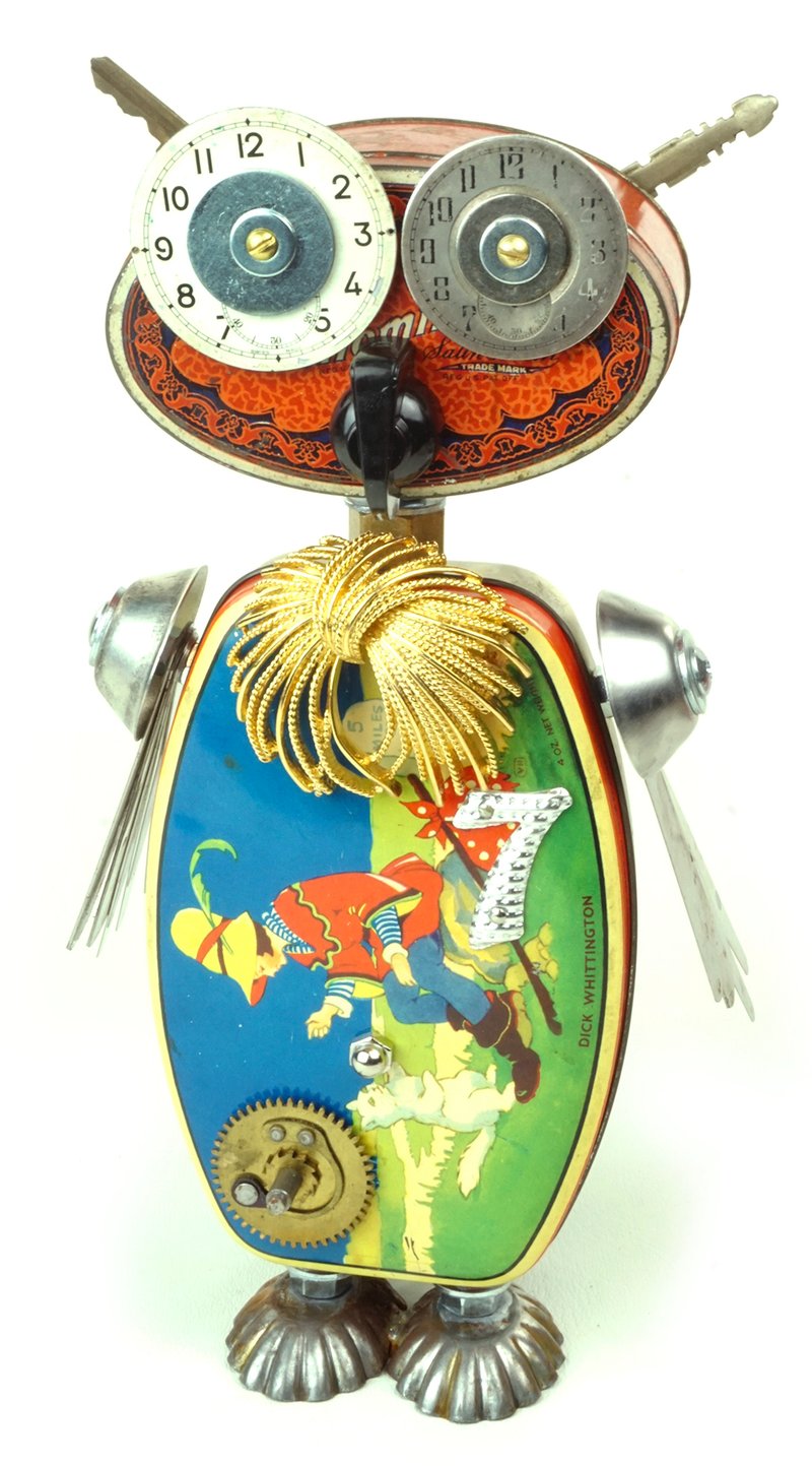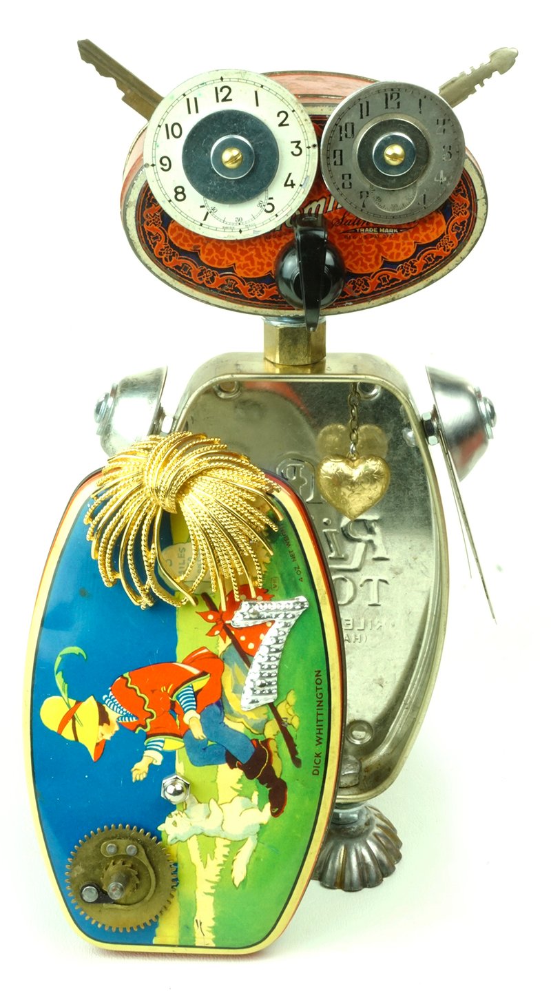 Principal Components: Toffee and mint tins, keys, watch dials, clock gear, chicken-head knob, feeler gauges, candy molds, steamer fin