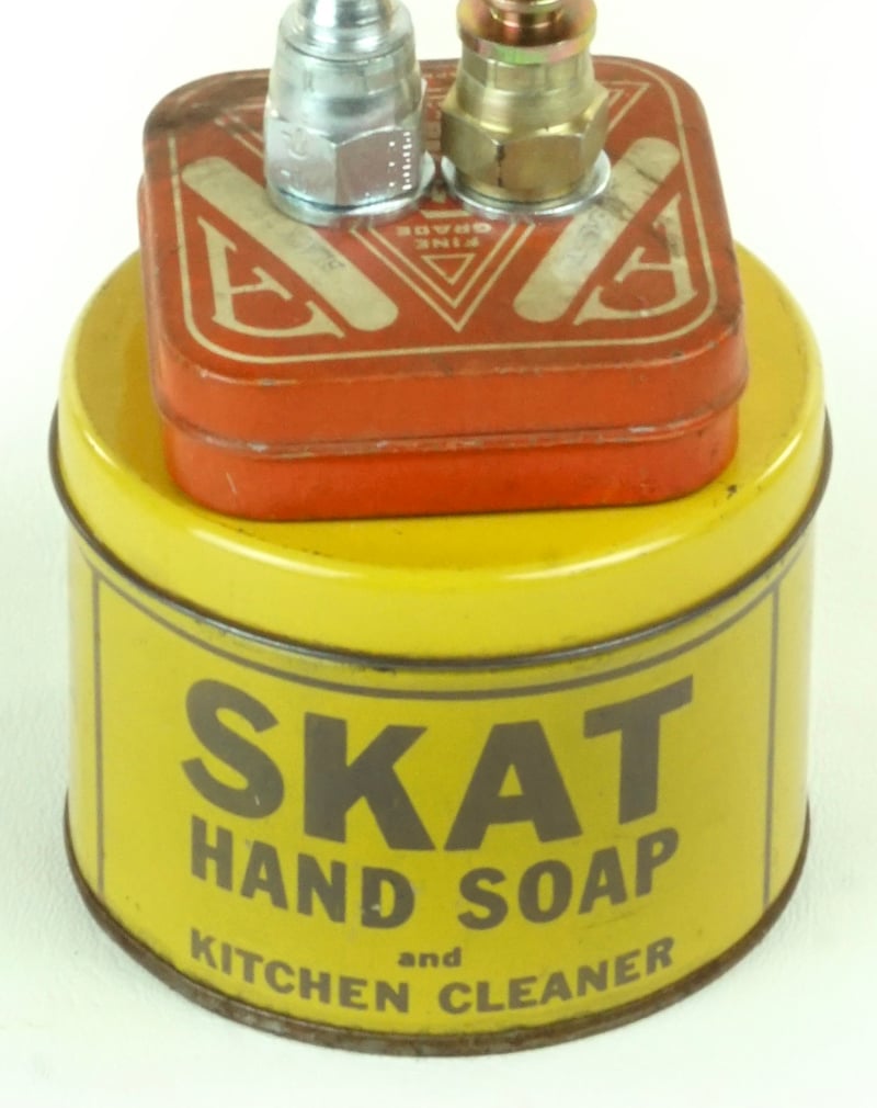 Principal Components: Bird food tin, pressure gauge, sash lock, telephone wire, hand soap can, typewriter ribbon tin, tartlet tin, hose fittings, wrenches