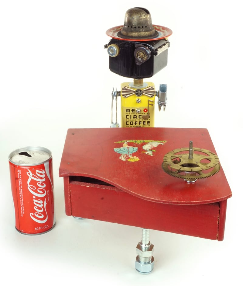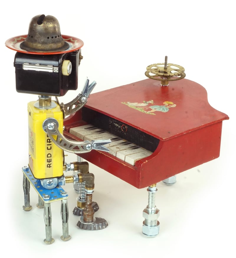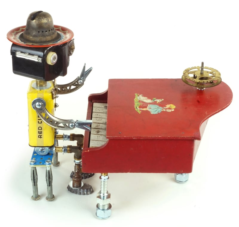Principal Components: Toy piano (it works!), coin bank, Baby Brownie camera, oil lamp burner part, toy saucer, erector set parts, toggle bolts, hose fittings, candy molds, clock gears