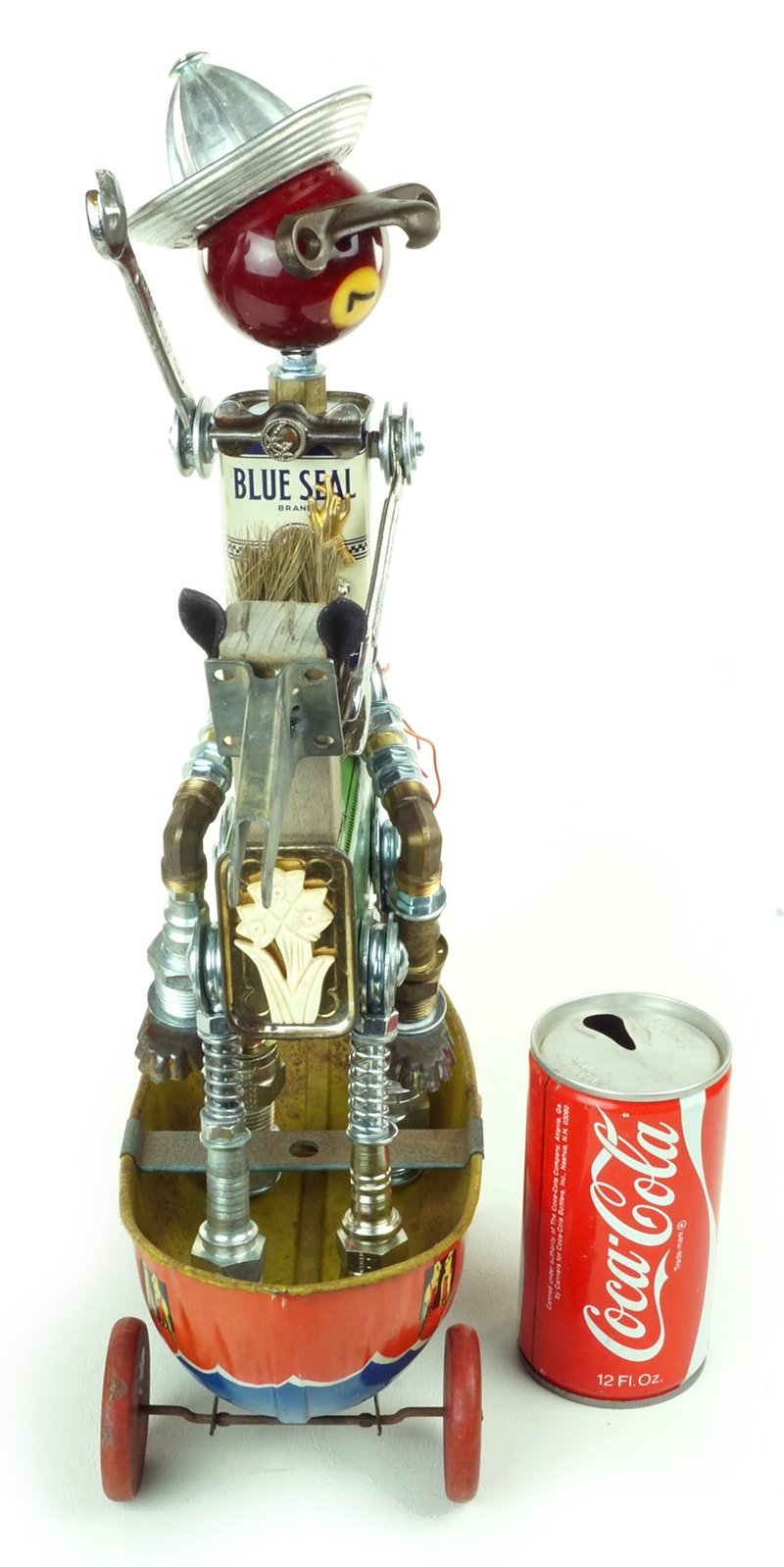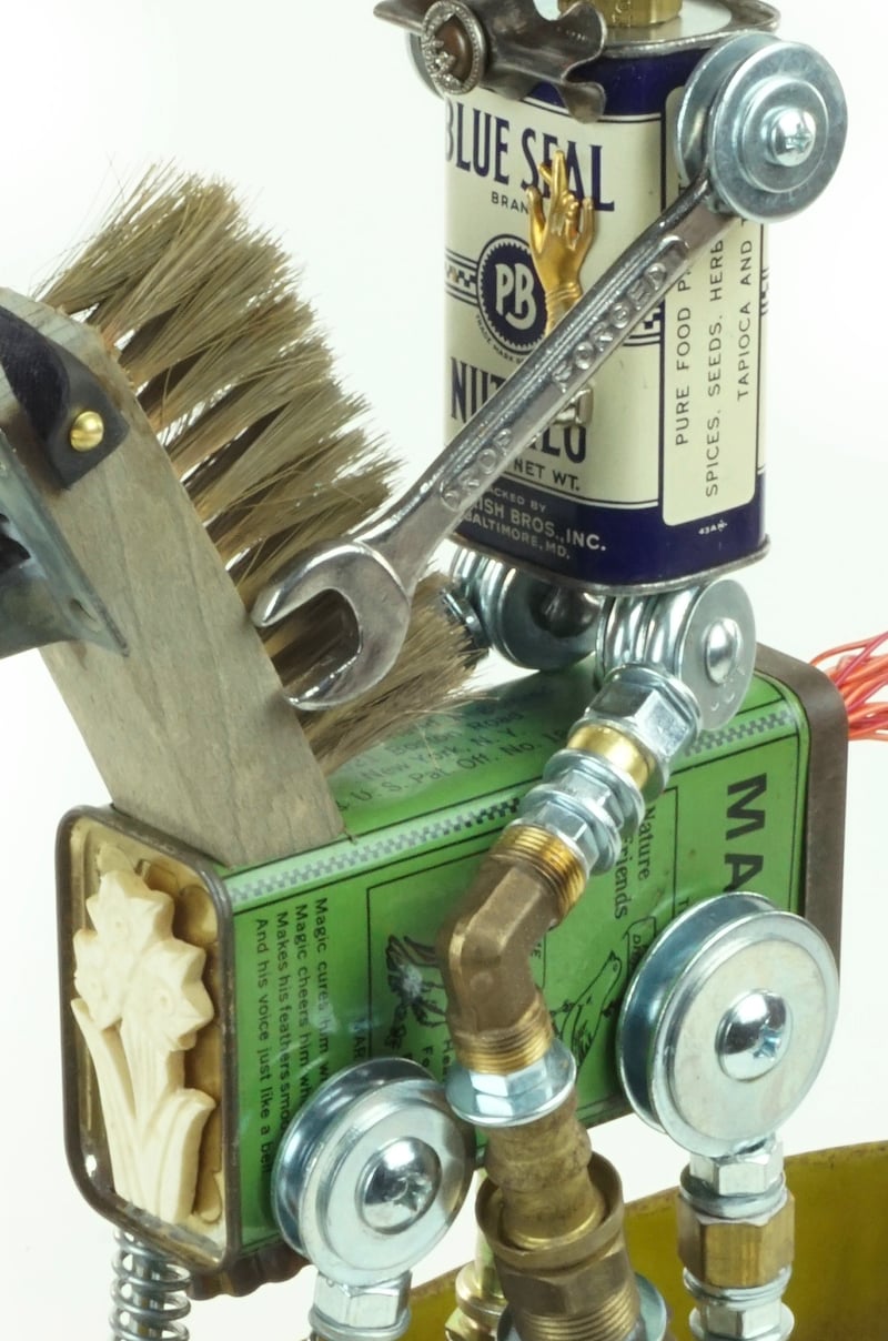 Principal Components: Spice tin, bird food tin, pool ball, sash lock, juicer, wire brush, screen door bracket, hose fittings, wrenches, toy boat, electrical wire, candy molds, clock gear