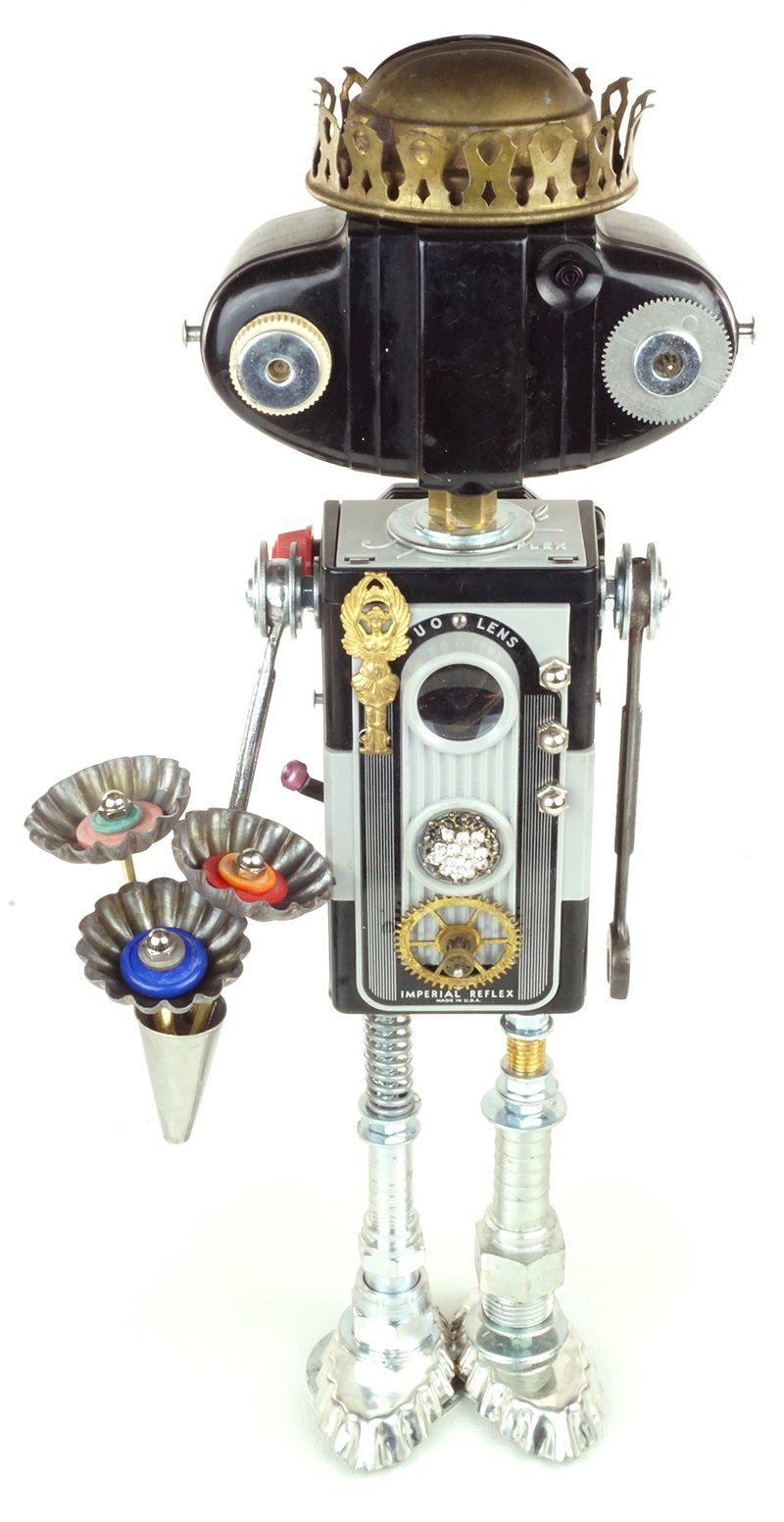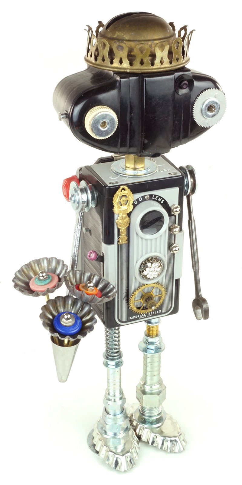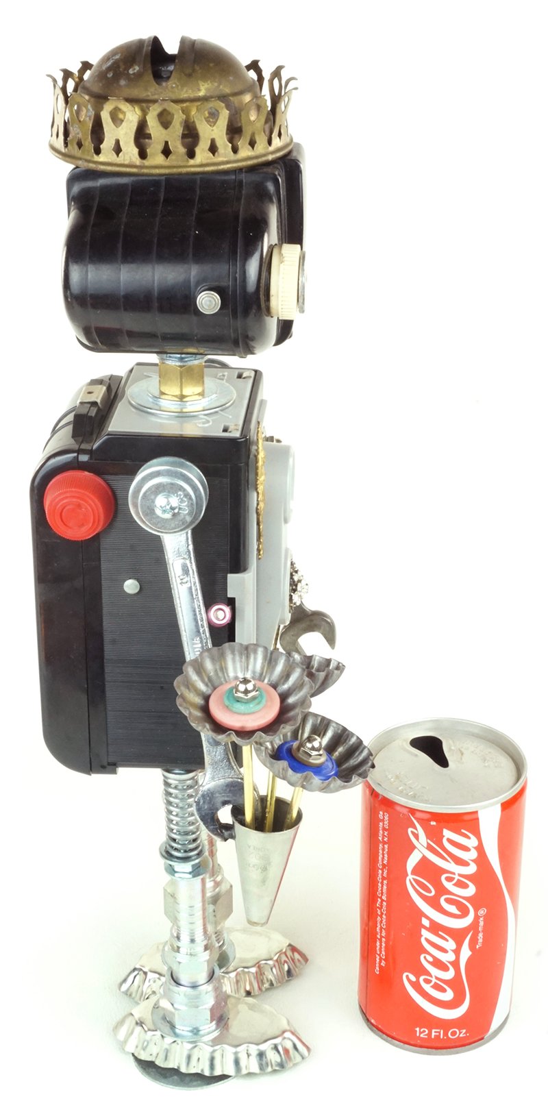 Principal Components: Imperial Reflex camera, Kodak 127 camera, oil lamp burner, wrenches, hose fittings, tartlet tins, cake decorating tip, candy molds, buttons, clock gears