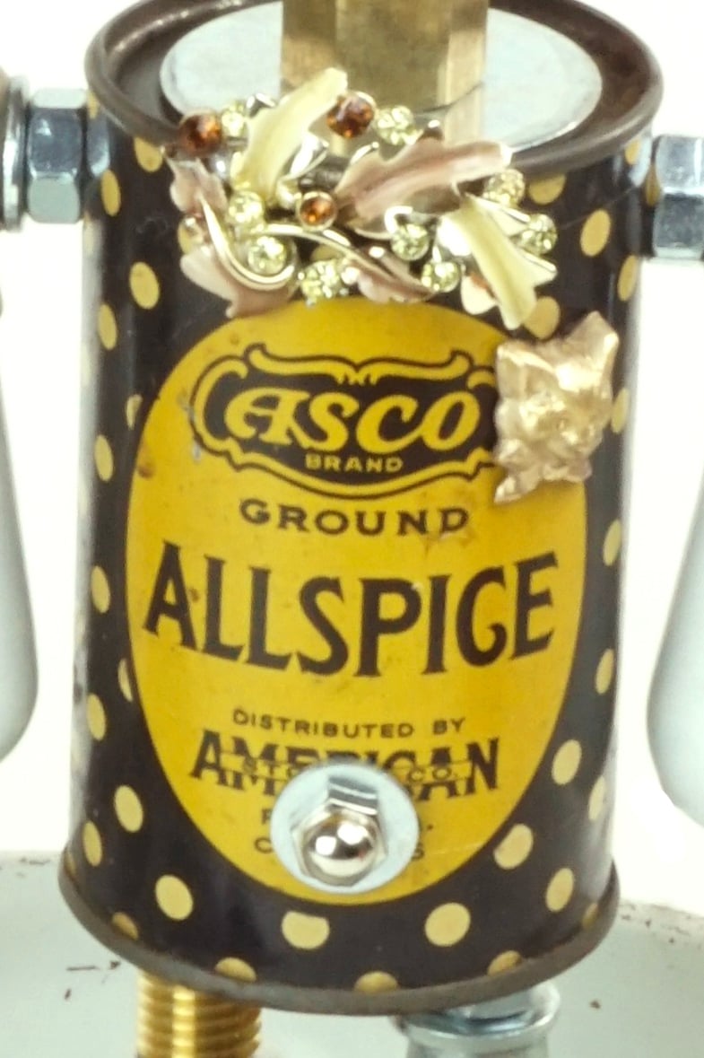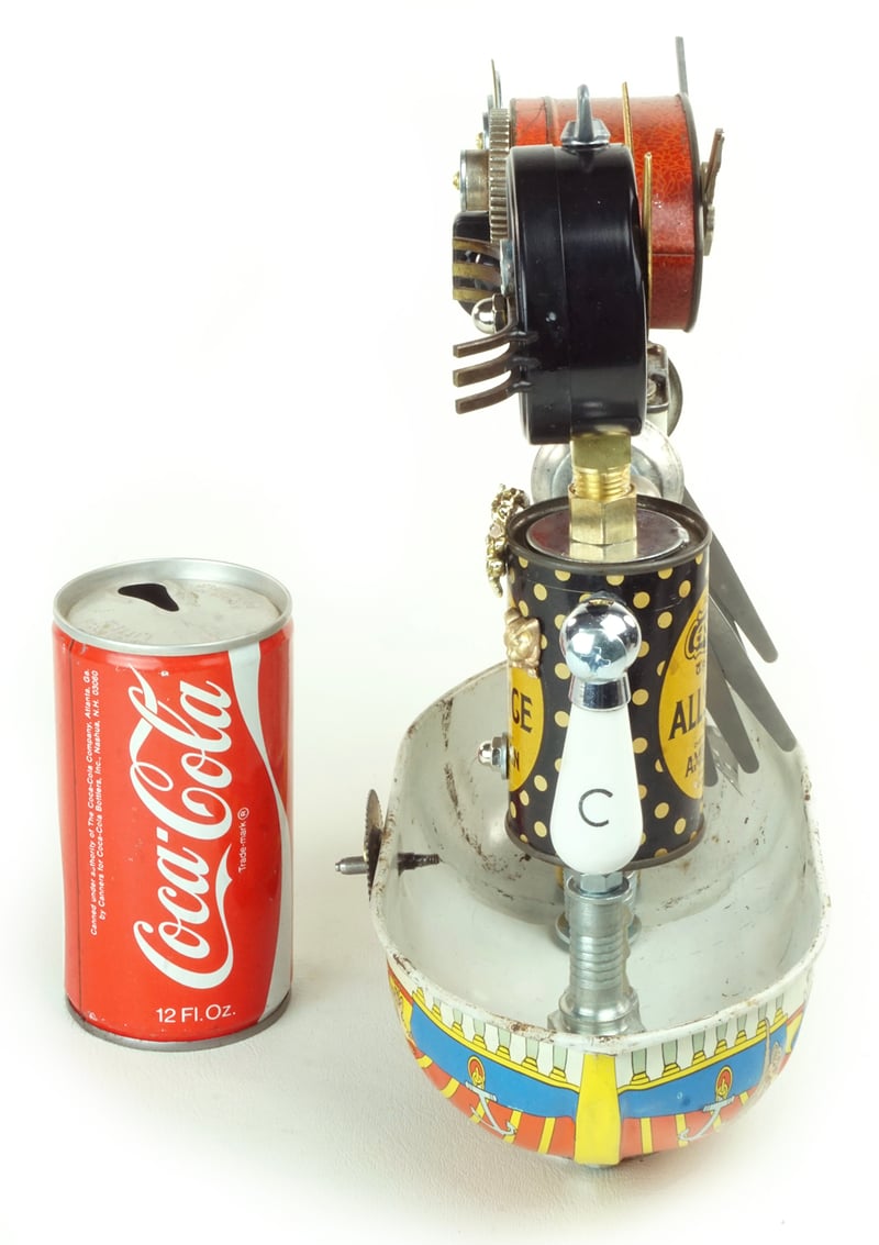 Principal Components: Spice tins, tin toy boat, pressure gauge, drawer pull, faucet handles, mint tin, watch dials, keys, chicken-head knob, candy molds, feeler gauges, hose fittings, steamer fin, clock gear, jewelry