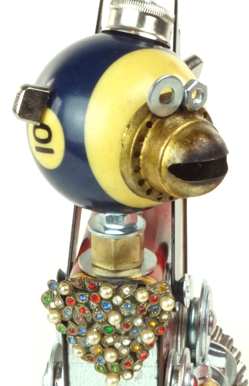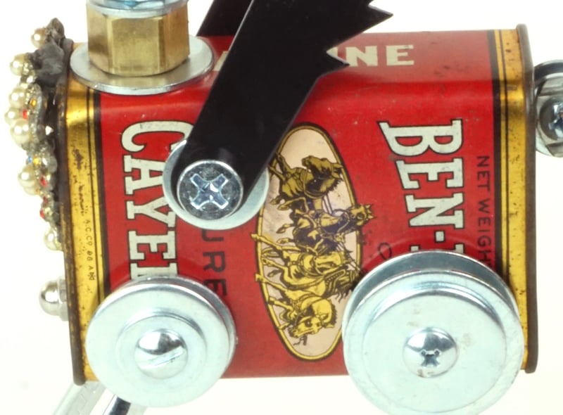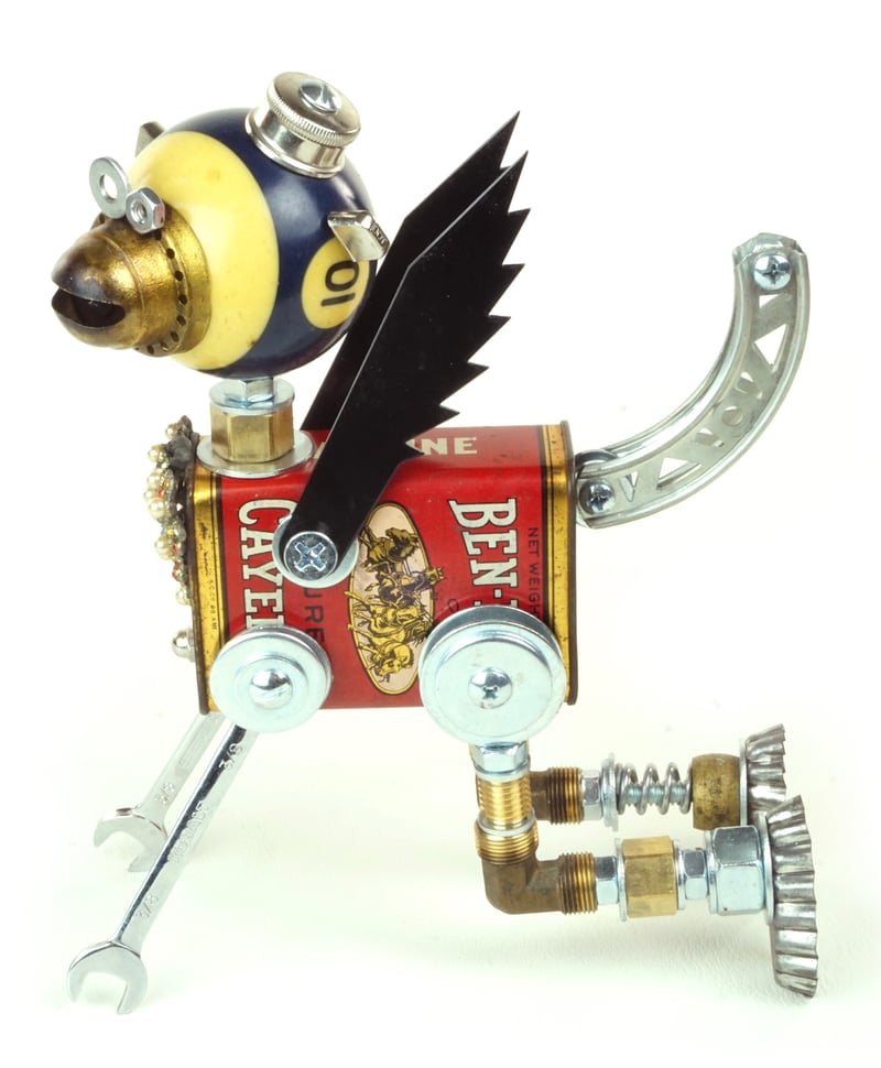 Principal Components: Spice tin, pool ball, oil lamp burner part, anti-kickback pawls, erector set girders, wrenches, hose fittings, candy molds