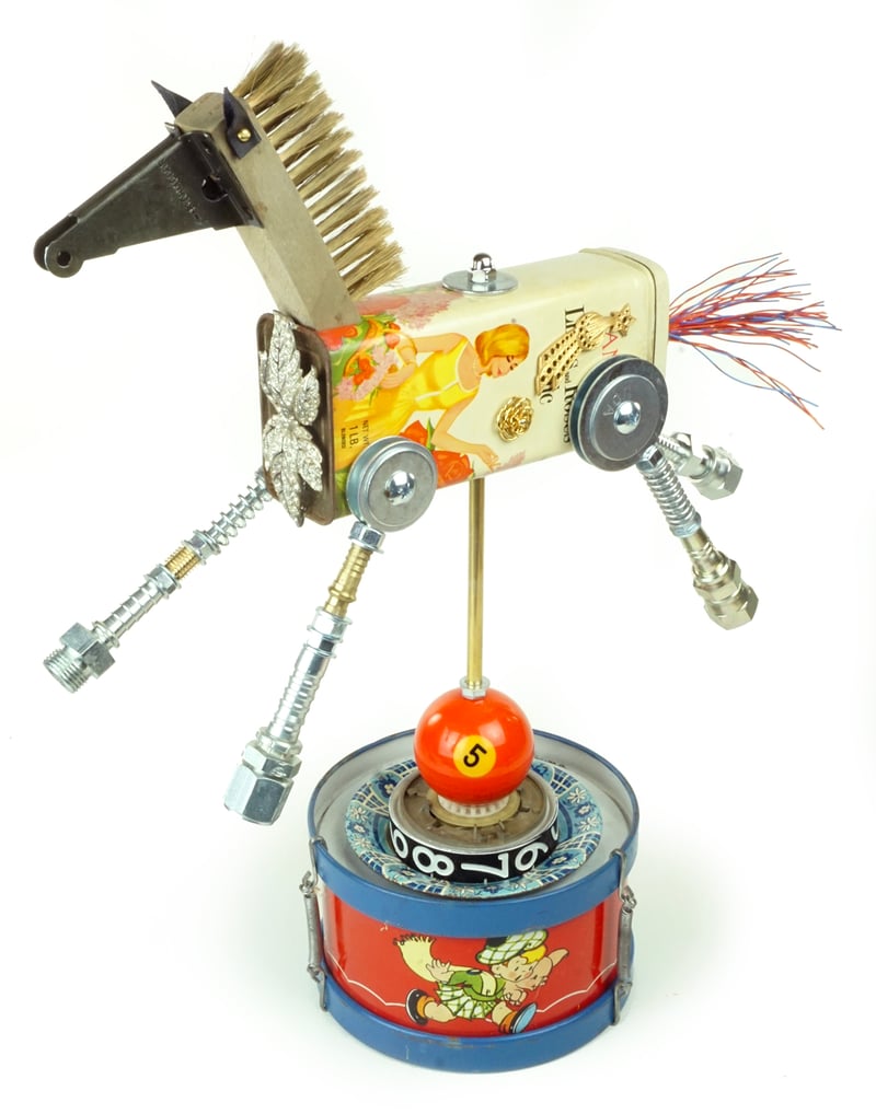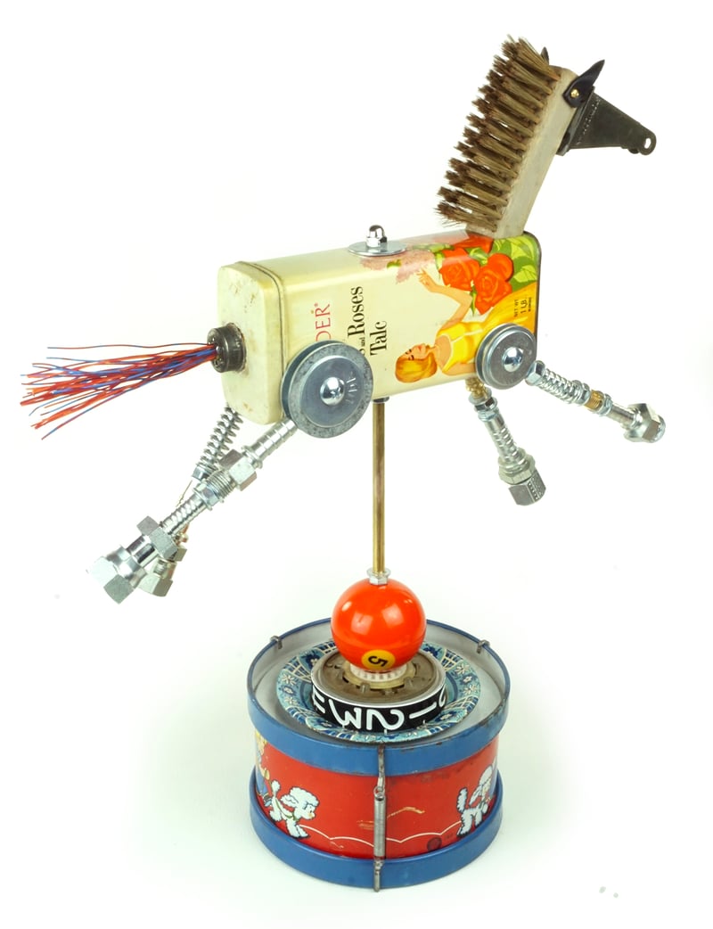 Principal Components: Talc tin, wire brush, screen door bracket, telephone wire, hose fittings, toy drum, pool ball, gas pump dial