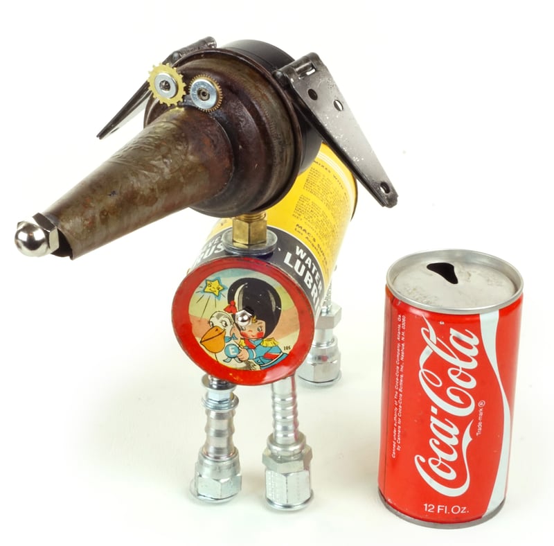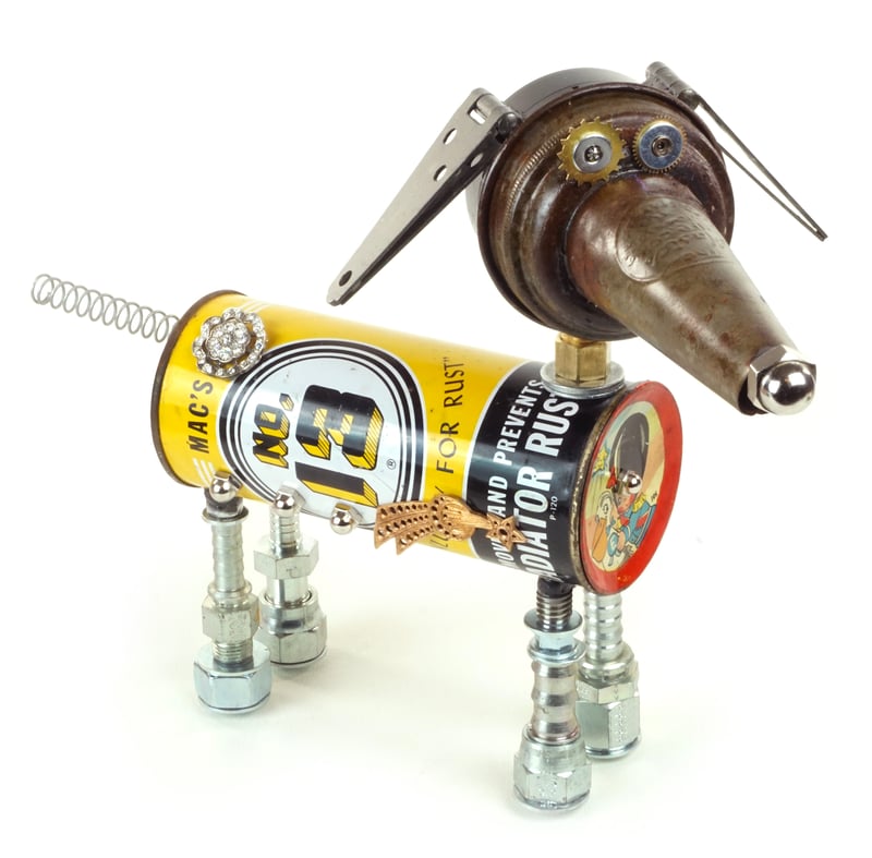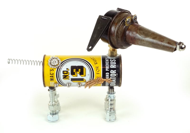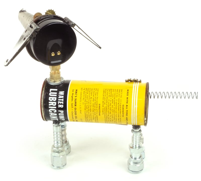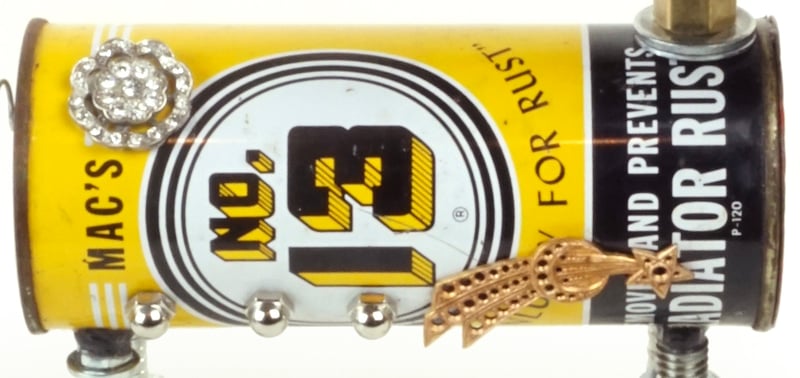 Principal Components: Engine additive can, oil bottle spout, pressure gauge, hinges, hose fittings, clock gears, toy saucer