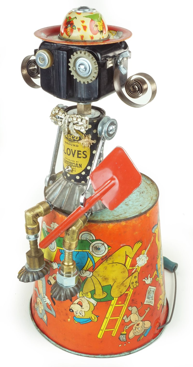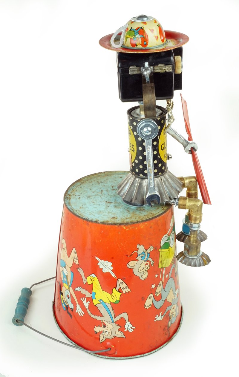 Principal Components: Beach pail and shovel, Baby Brownie camera, clock springs, spice tin, toy teacup and saucer, tartlet tin, wrenches, hose fittings, candy molds