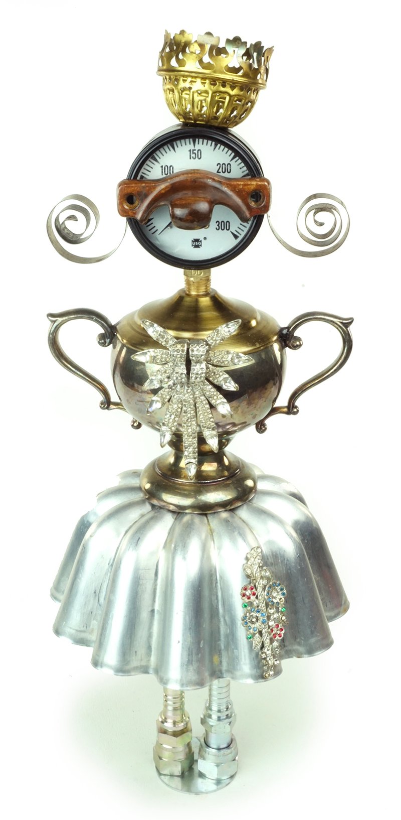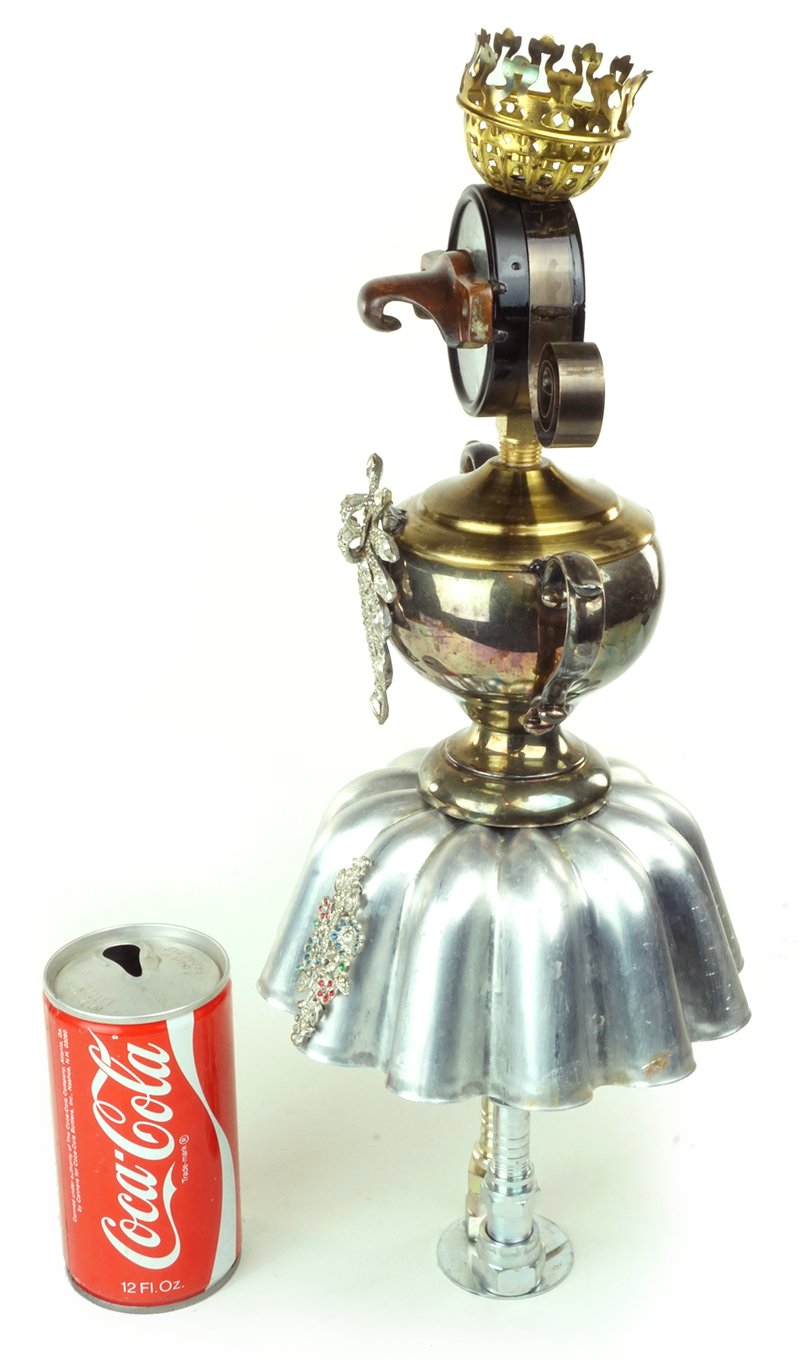Principal Components: Sugar bowl, pressure gauge, sash lock, jello mold, clock springs, gas lamp burner, hose fittings, lamp cap, rhinestone brooches