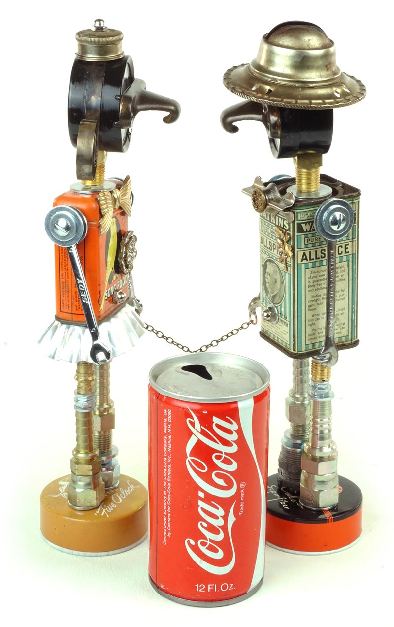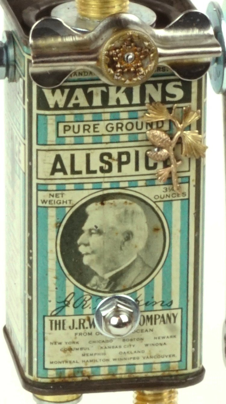 Principal Components: Spice tin, bird food tin, pressure gauges, sash locks, oil lamp burner, clock springs, tartlet tin, hose fittings, wrenches, typewriter ribbon tins