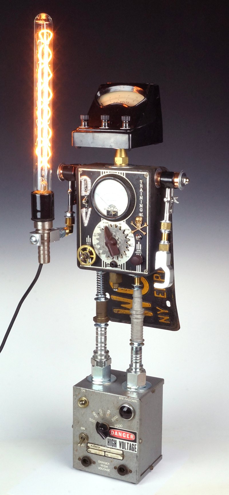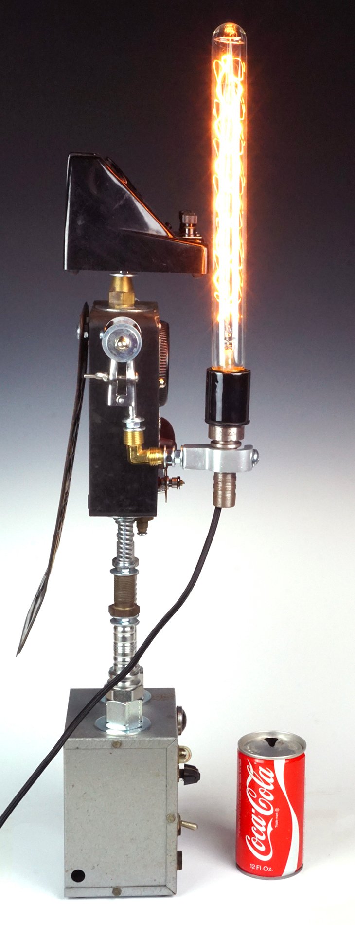 Principal Components: Multimeter, volt meter, hipot tester, test tube clamps, "Empire State" license plate, reproduction Edison bulb, hose fittings, clock gear