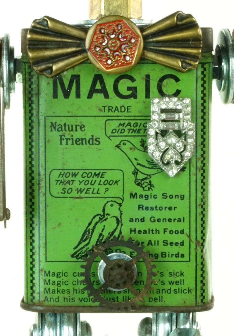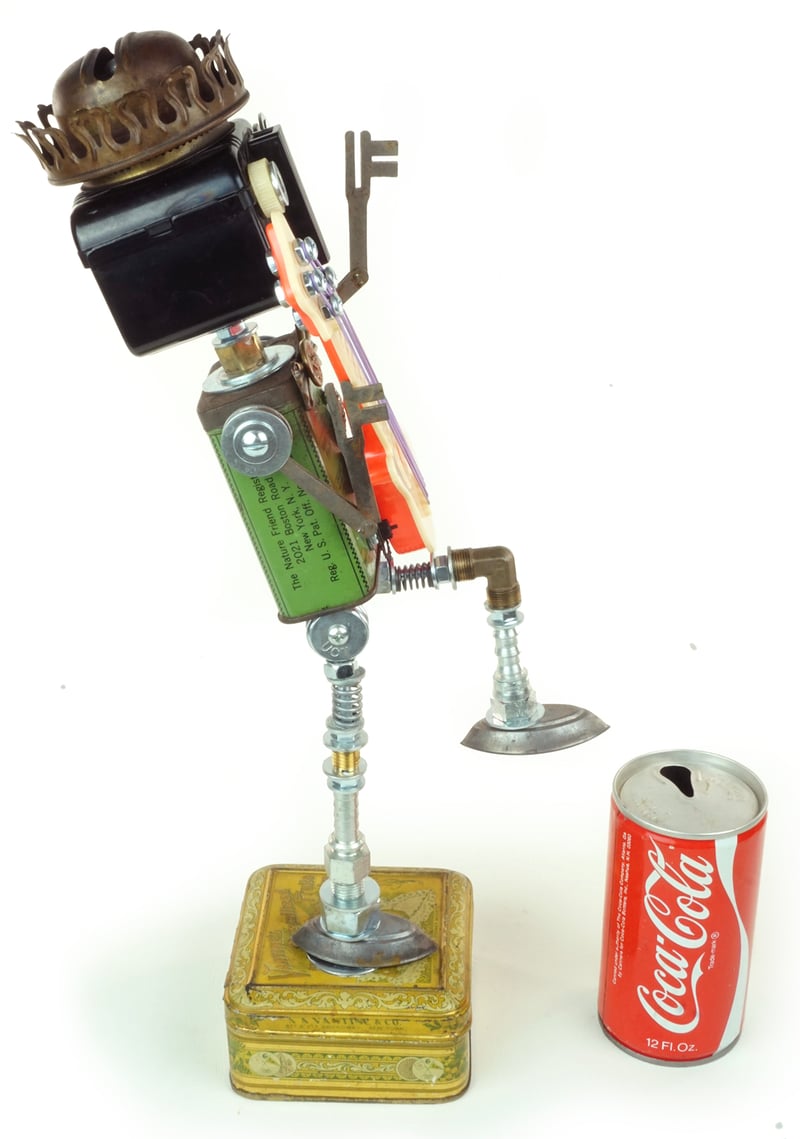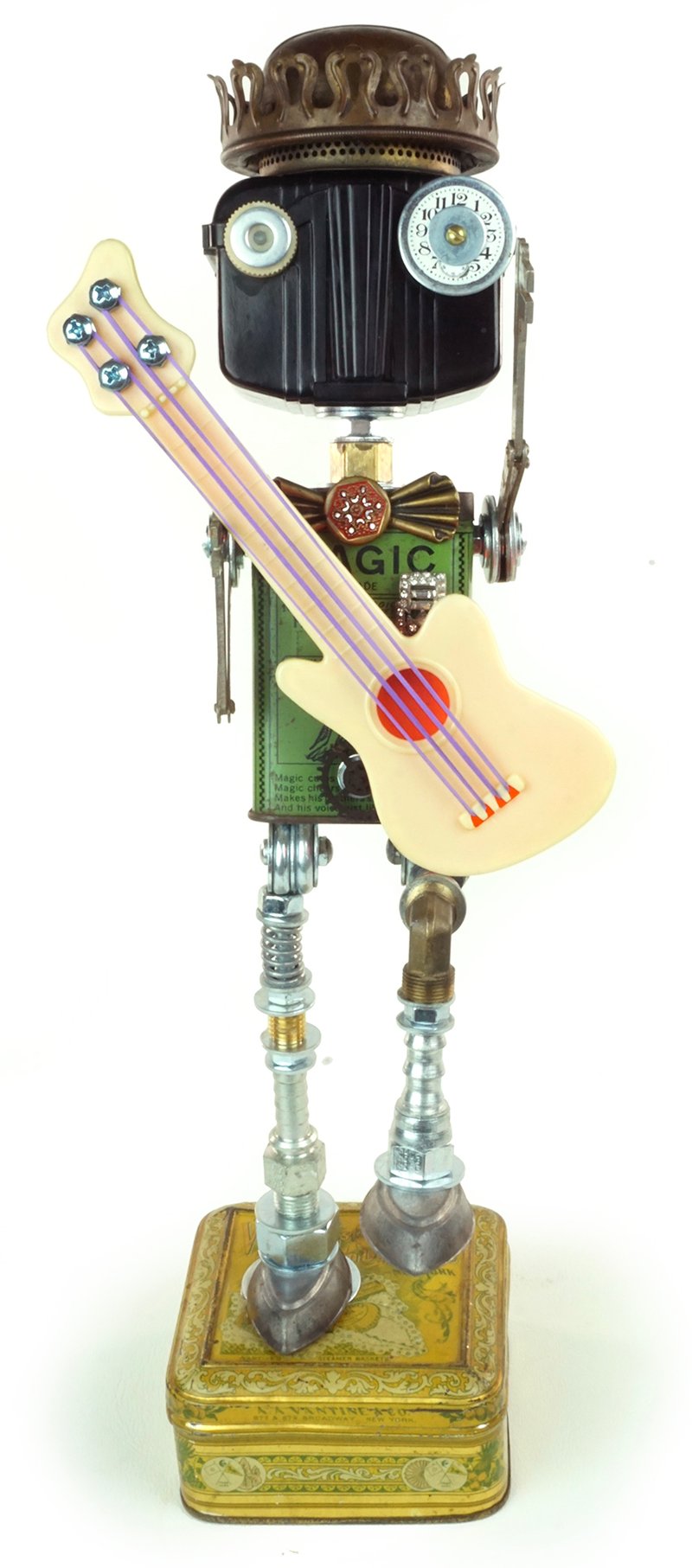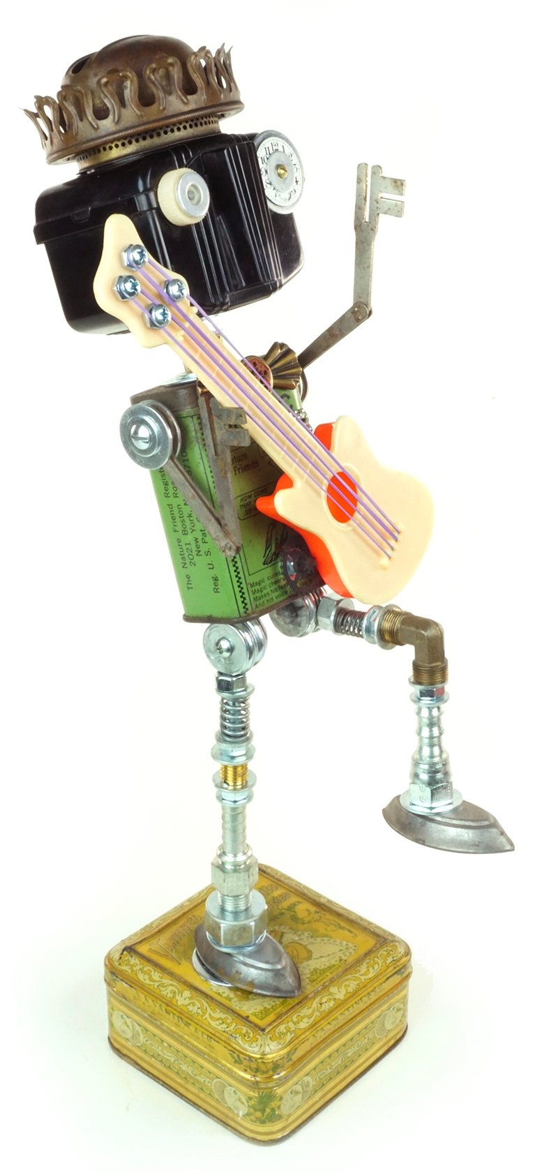 Principal Components: Bird food tin, Baby Brownie camera, oil lamp burner, guitar party favor, folding skeleton keys, hose fittings, candy molds, rhinestone clip, clock gears, watch face, candy tin