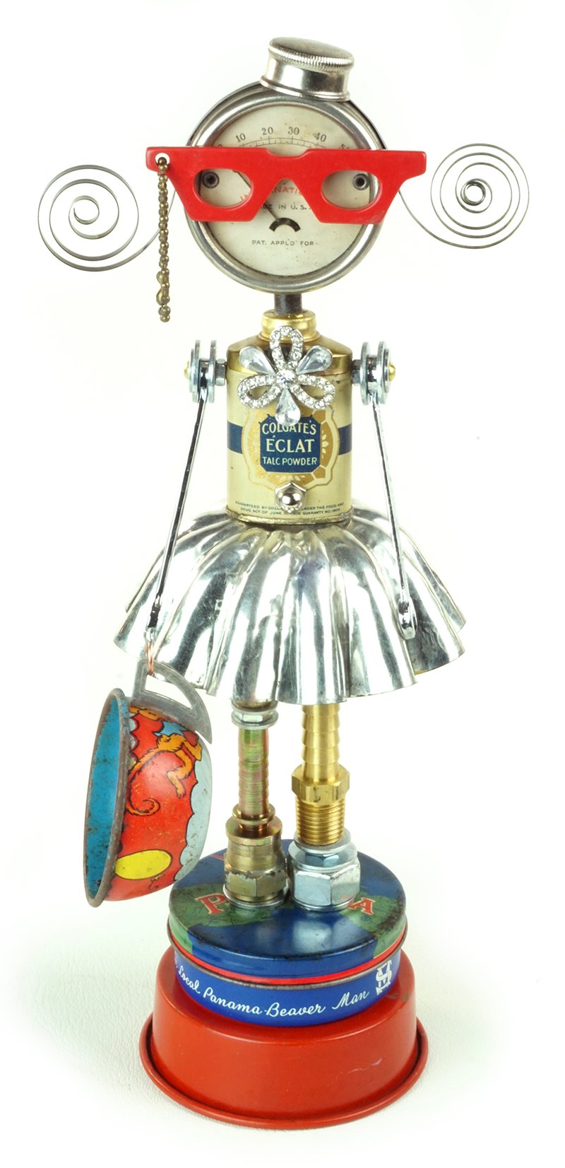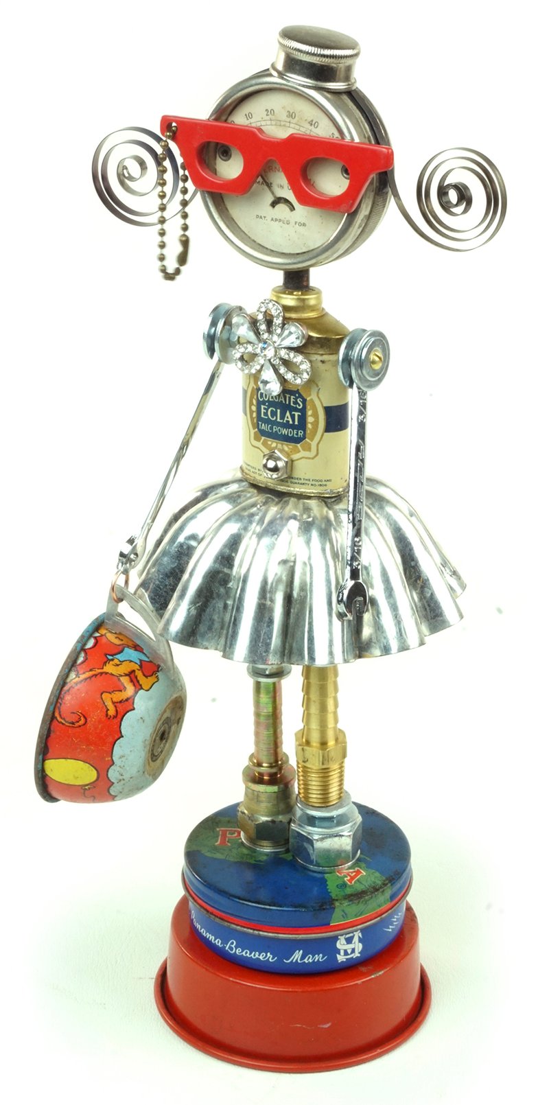 Principal Components: Sample talcum powder tin, battery tester, keychain, clock springs, baking mold, typewriter ribbon tin, toy cup, hose fittings, wrenches