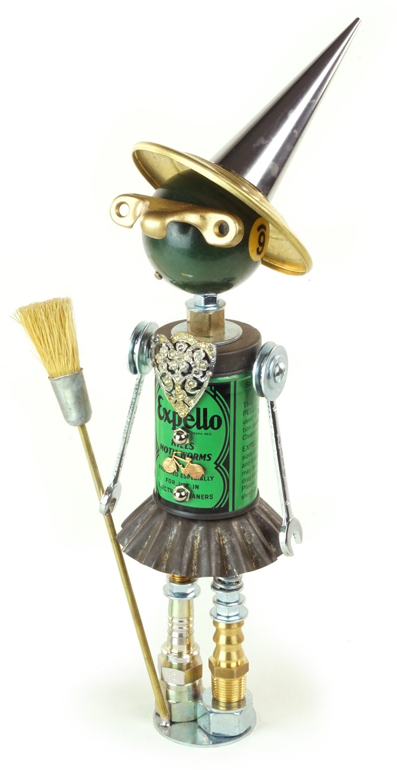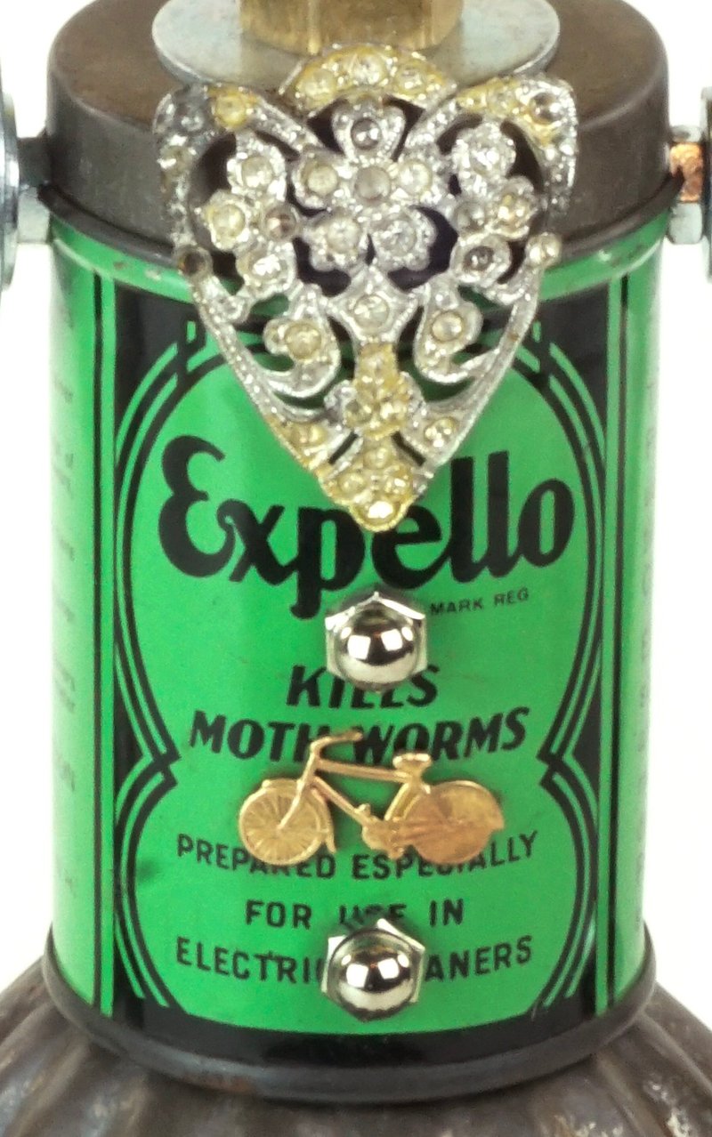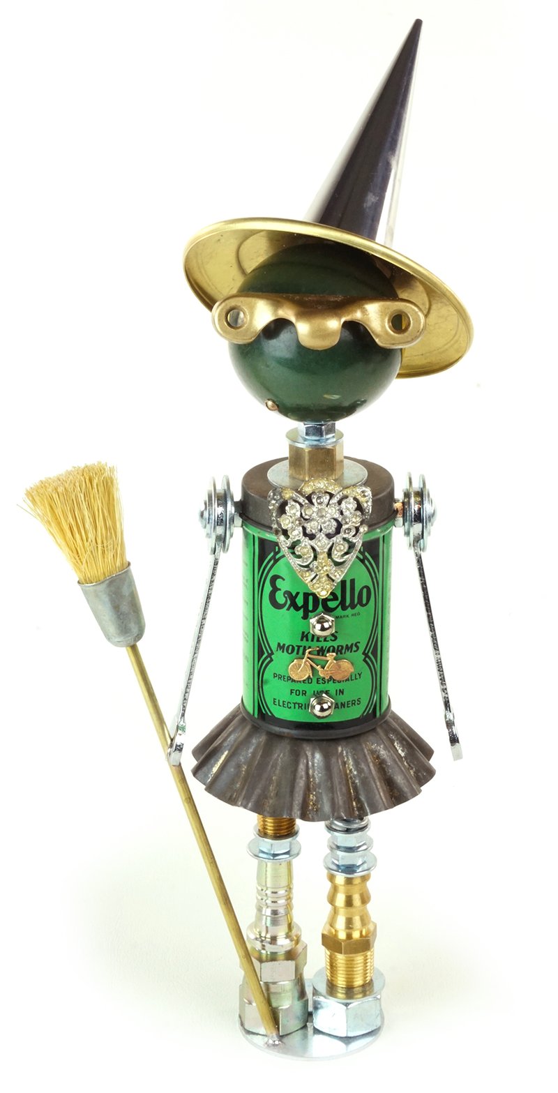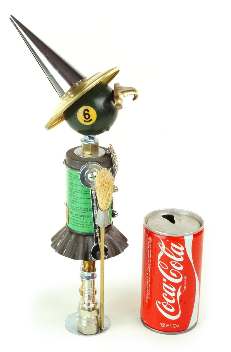 Principal Components: Moth crystals tin, pool ball, sash lock, basting brush, tartlet tin, wrenches, hose fittings, lamp cap, pastry cone, rhinestone dress clip