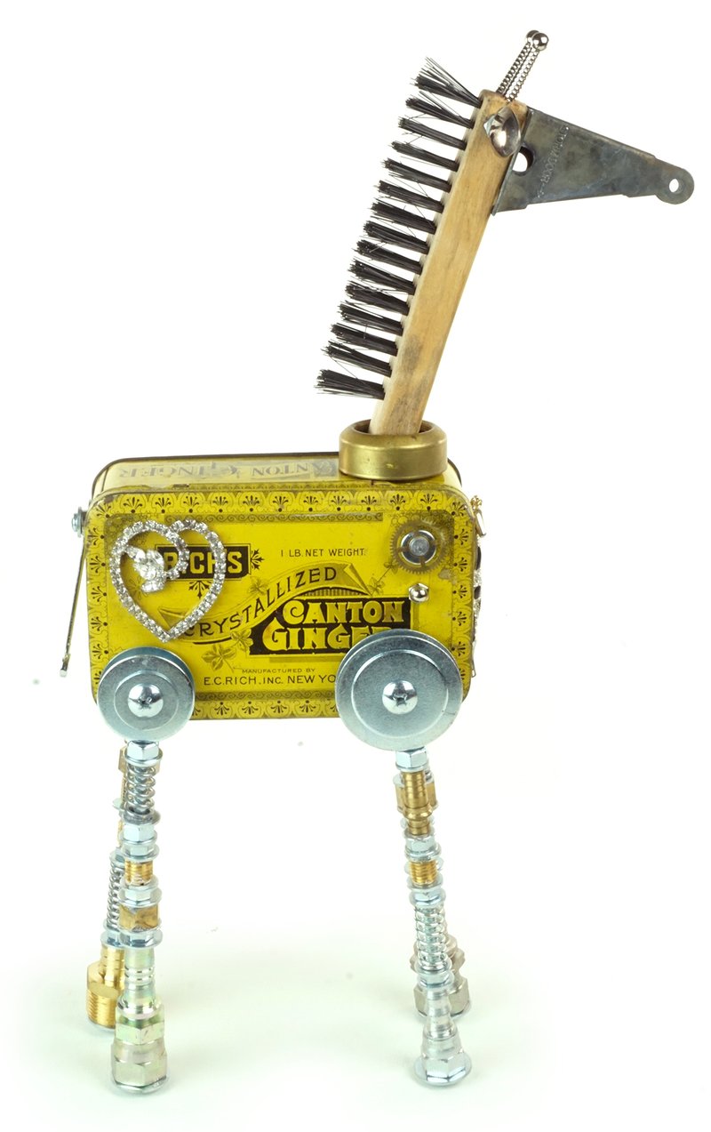 Principal Components: Crystallized ginger tin, wire brush, screen door bracket, bolo tie tips, souvenir spoons, hose fittings, wrench, jewelry, clock gear