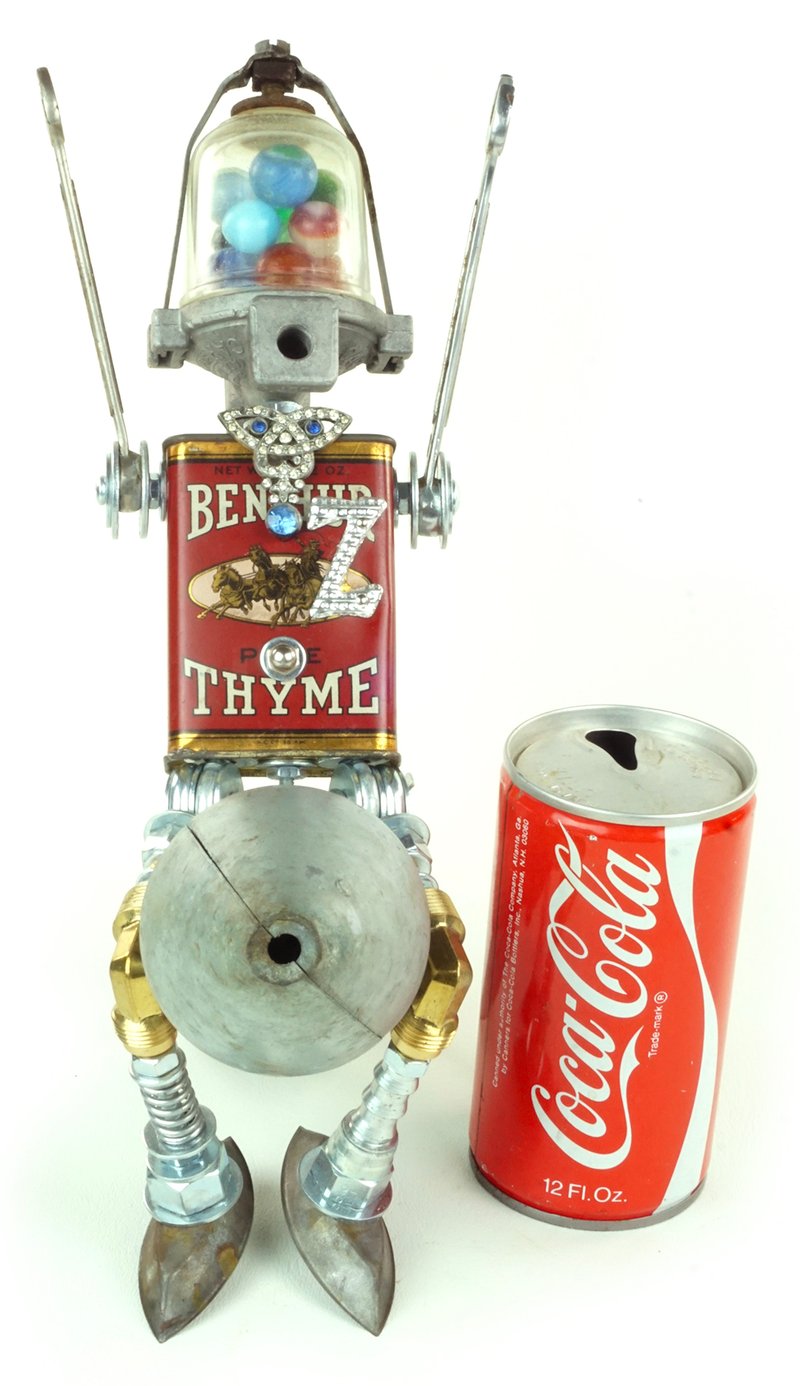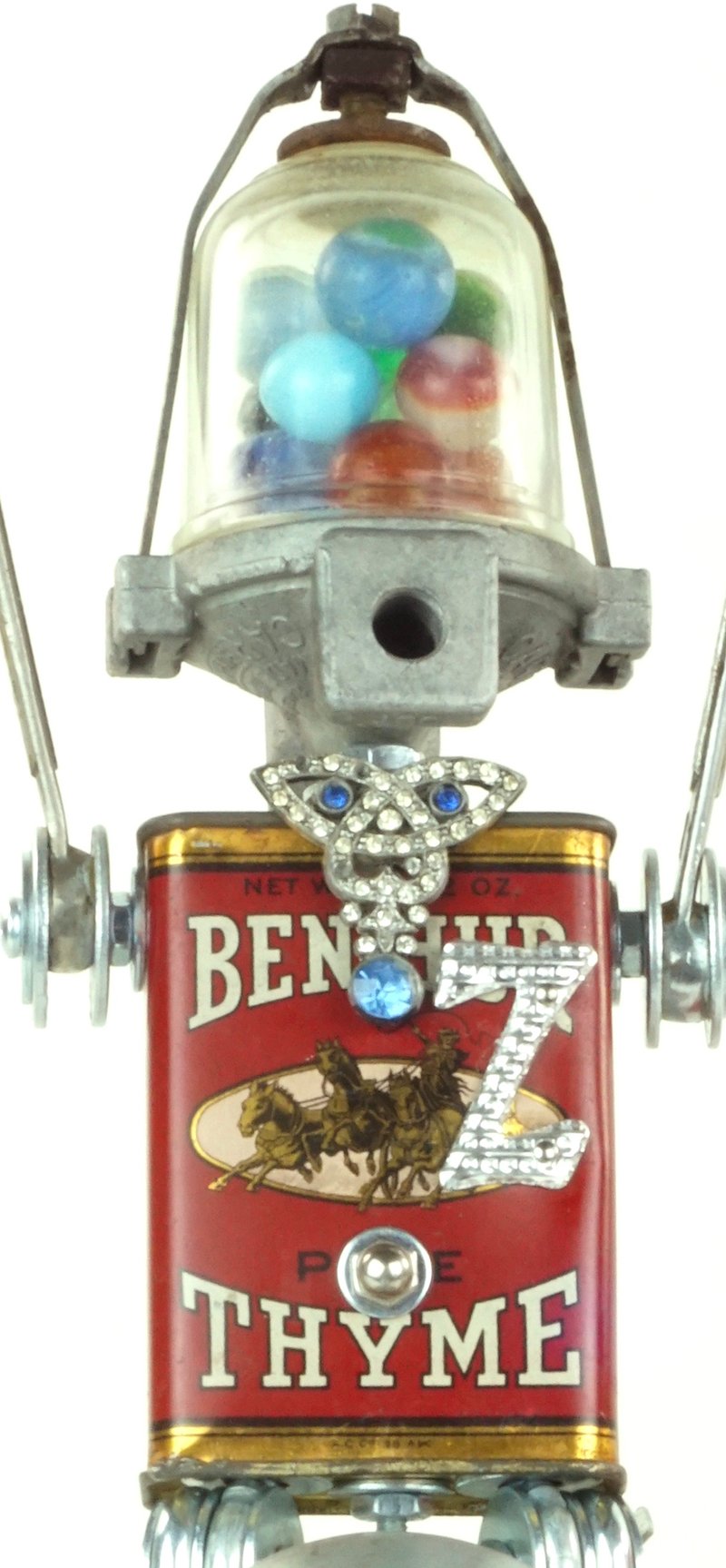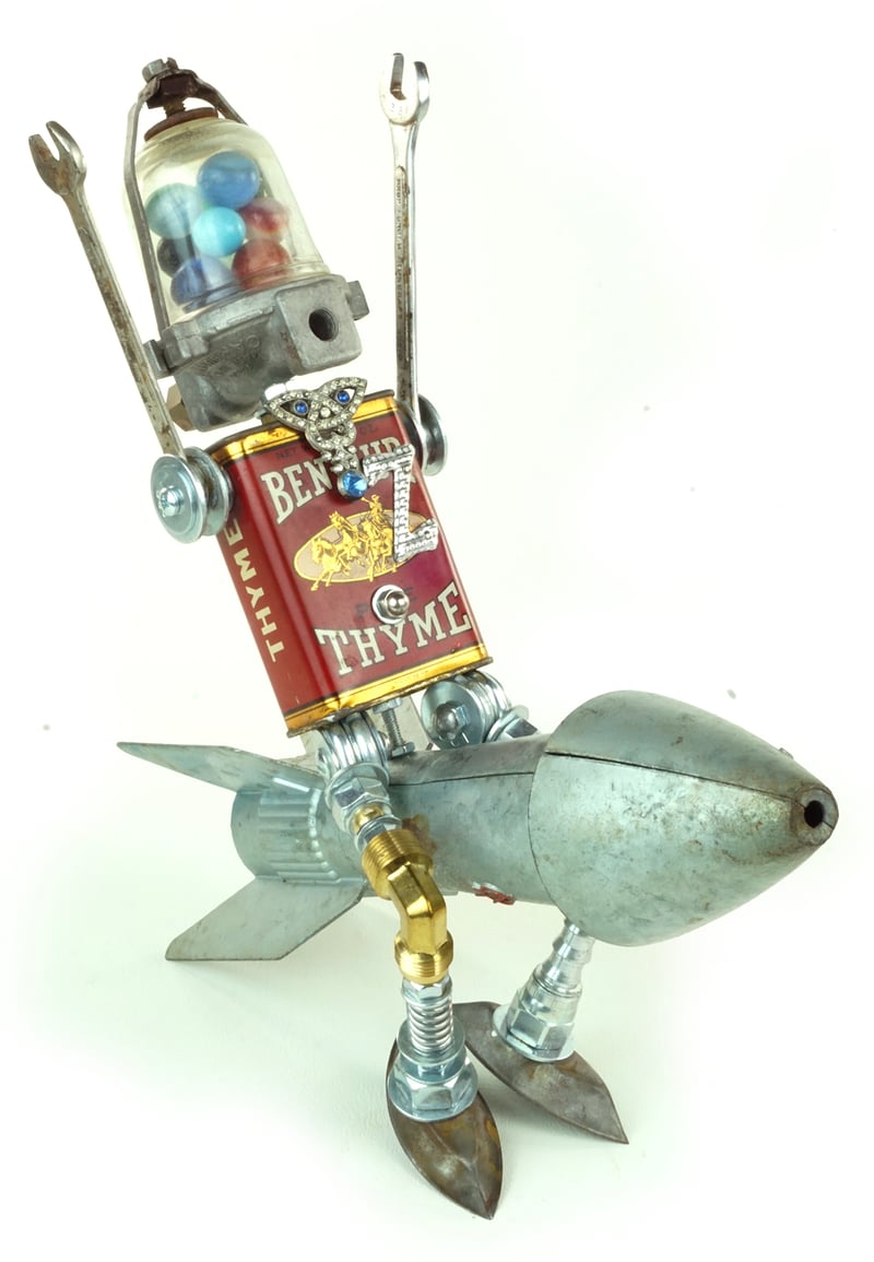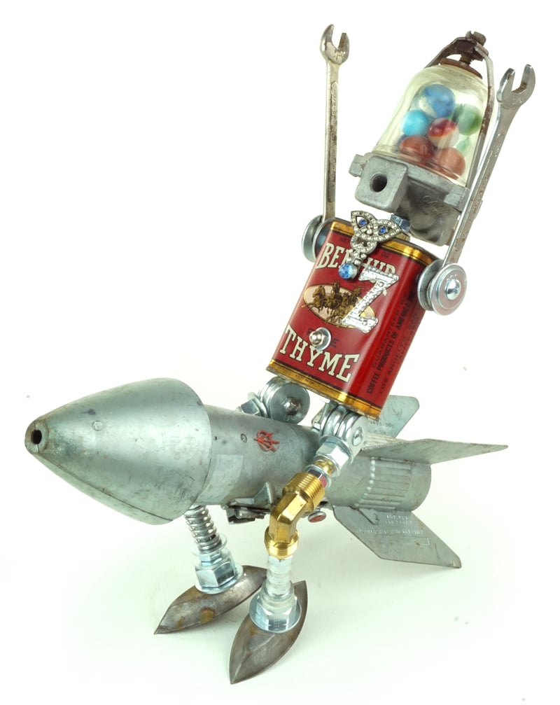 Principal Components: Rocket coin bank, spice tin, glass bowl fuel filter, marbles, wrenches, hose fittings, candy molds, rhinestone shoe clip